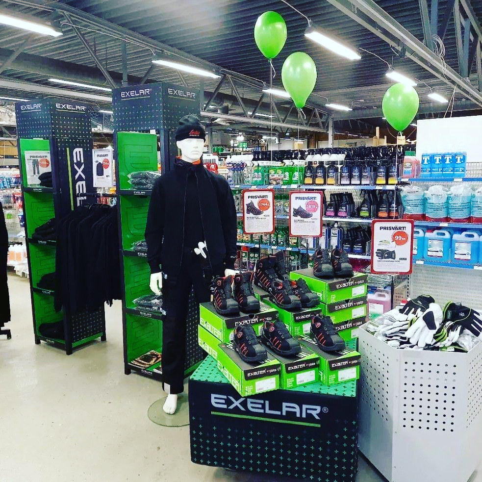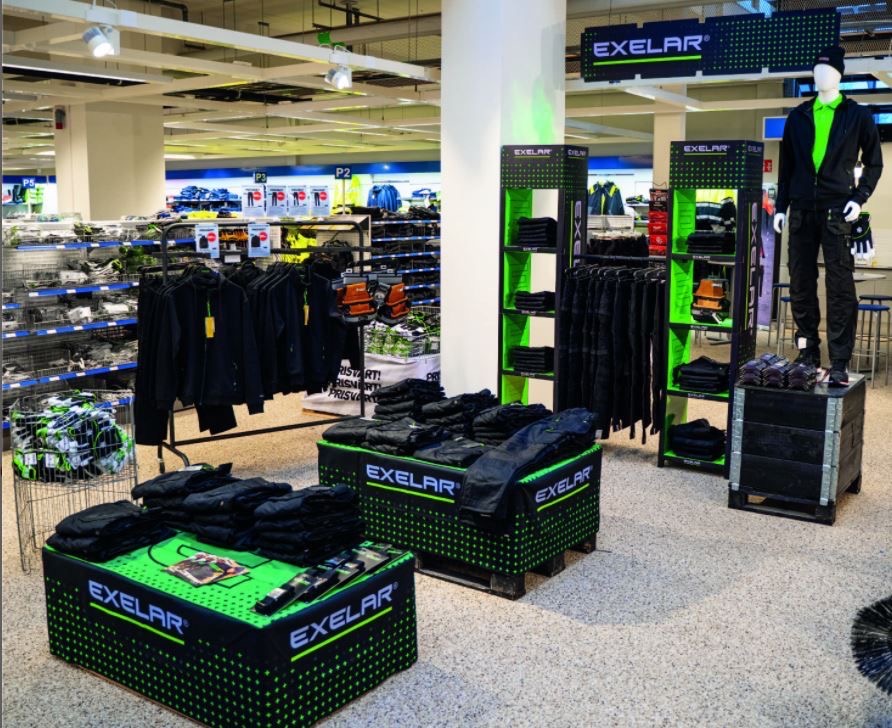 El cliente EXELAR que fabrica y vende ropa de trabajo en el Norte de Europa, le pidió al productor de material POP en Suecia, un desarrollo para distintos tamaños de tiendas, en las frias zonas de montaña .