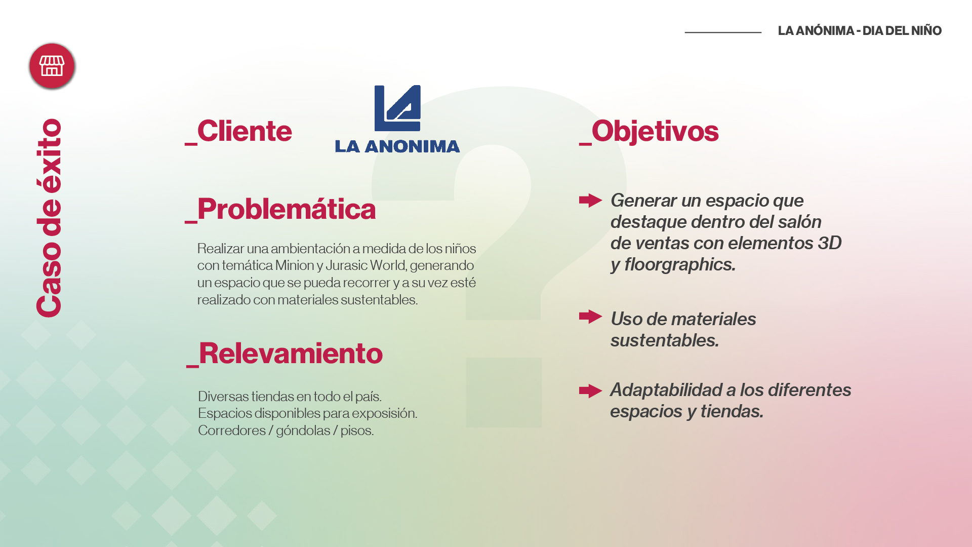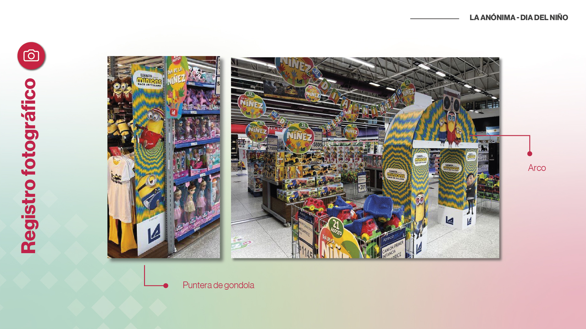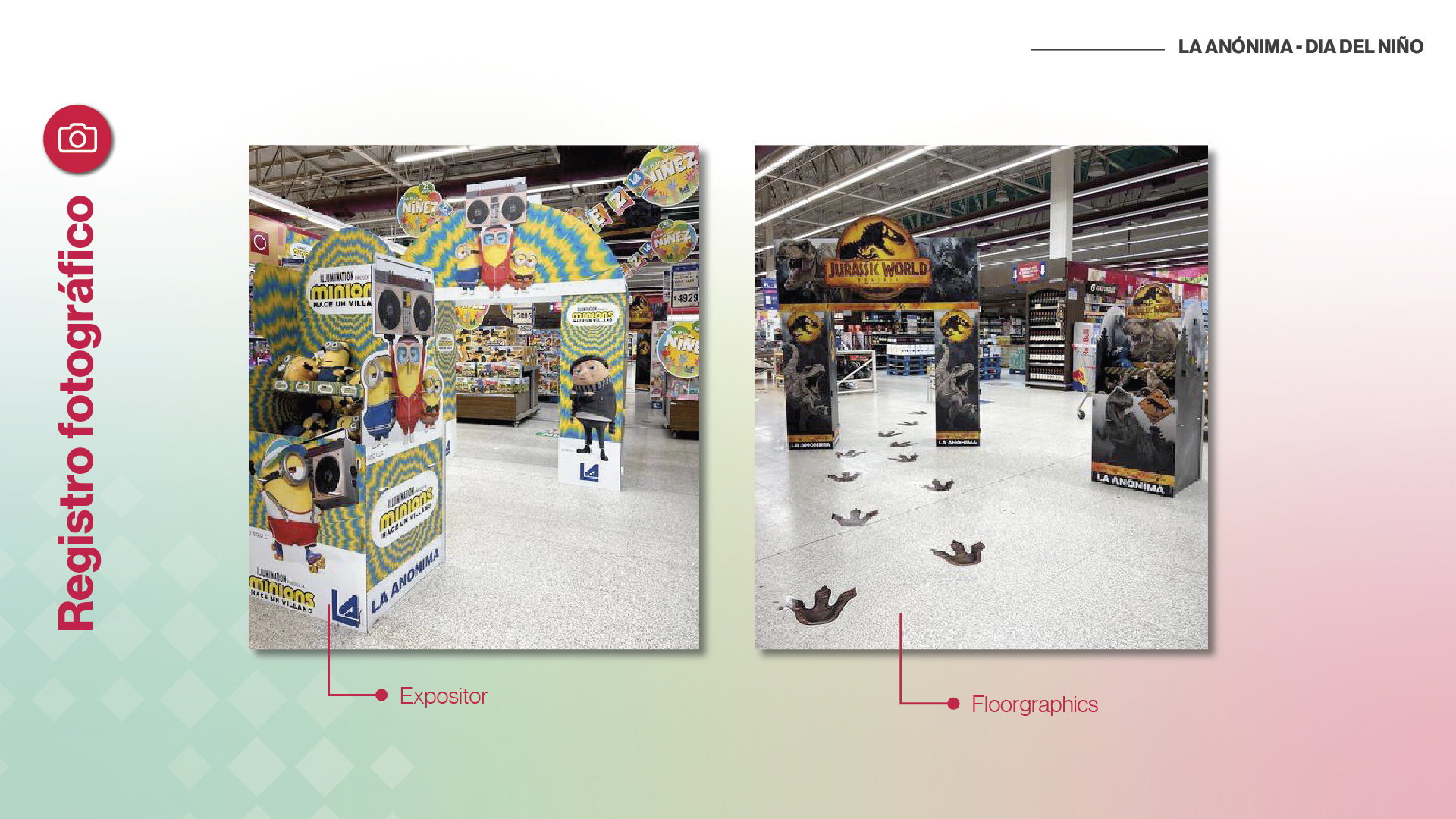 Para ambientar sus tiendas con motivo del dÃa del niño, La Anónima realizó un acuerdo con Universal Studios, aprovechando el lanzamiento de dos pelÃculas de la firma: Minions y Jurassic Park. Nos solicitaron realizar una ambientación a medida de los niños, generando un espacio que se pueda recorrer y que nos lleve al universo de estas dos pelÃculas. Además, nos pidieron utilizar exclusivamente materiales sustentables.