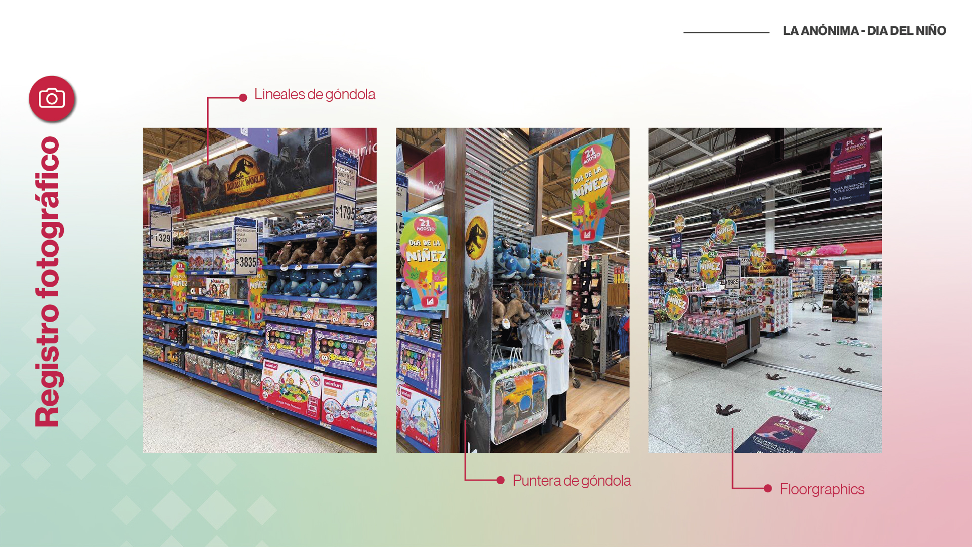 Se propone un espacio exclusivo para los niños: Un arco pequeño marca la entrada, que cuenta con tótems y exhibidores de pie para mostrar todos los juguetes. Floorgraphics y colgantes arman la ambientación, cerrando un espacio llamativo y que resalta en la tienda. Para seguir la consigna de la sustentabilidad, todos los elementos se realizaron en materiales reciclables: Reemplazando el corrugado plástico con BubbleBoard 3R (70% reciclado) y PSAI recuperado, y utilizando cartulinas para los banderines. Además, nos encargamos de retirar todos estos elementos una vez que terminó la activación, para su correcta disposición y reciclado.