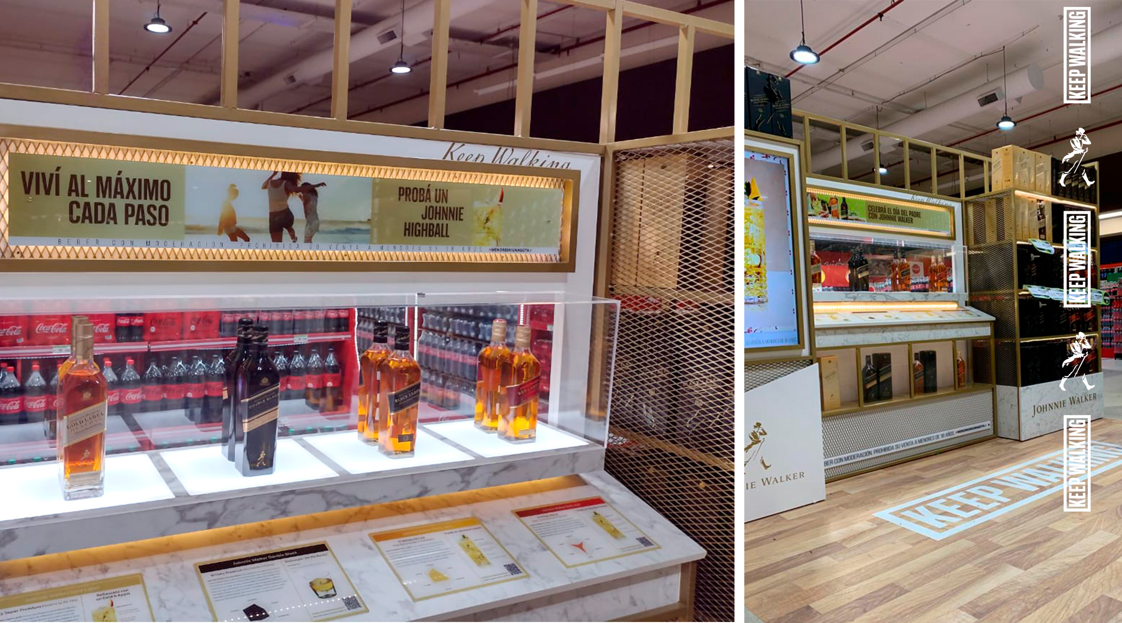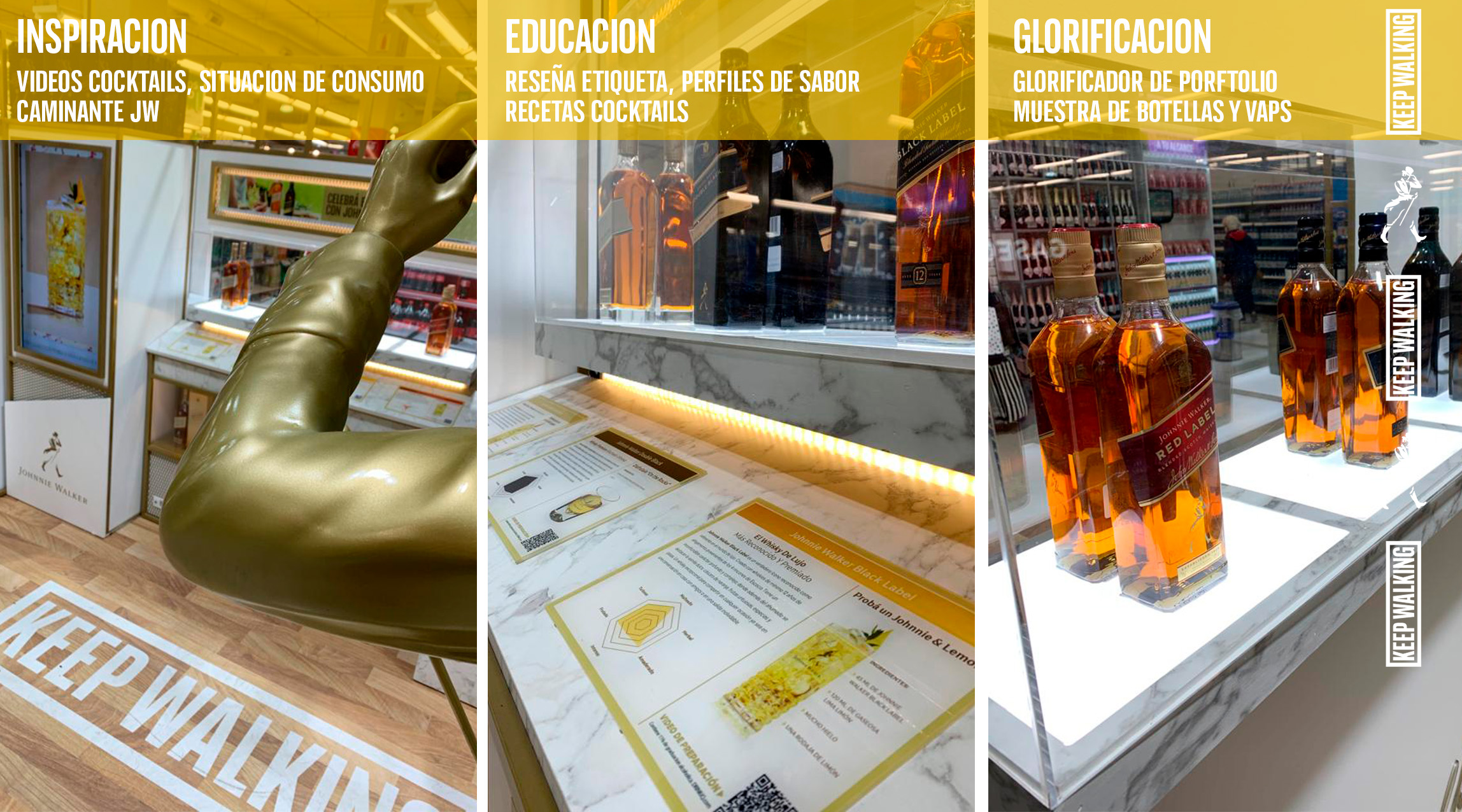 Se diseño un muro de exhibición del portfolio con vitrinas glorificadoras bifaz iluminadas, mostrador de educación infográfica, vitrinas con packs especiales y pantallas multimedia con educación sobre recetas de cocktails con JW y videos institucionales de la marca. Todas las gráficas son intercambiables, para poder reutilizar el stand en distintos seasonals (Ej. Dia del Padre/Fin de Año)