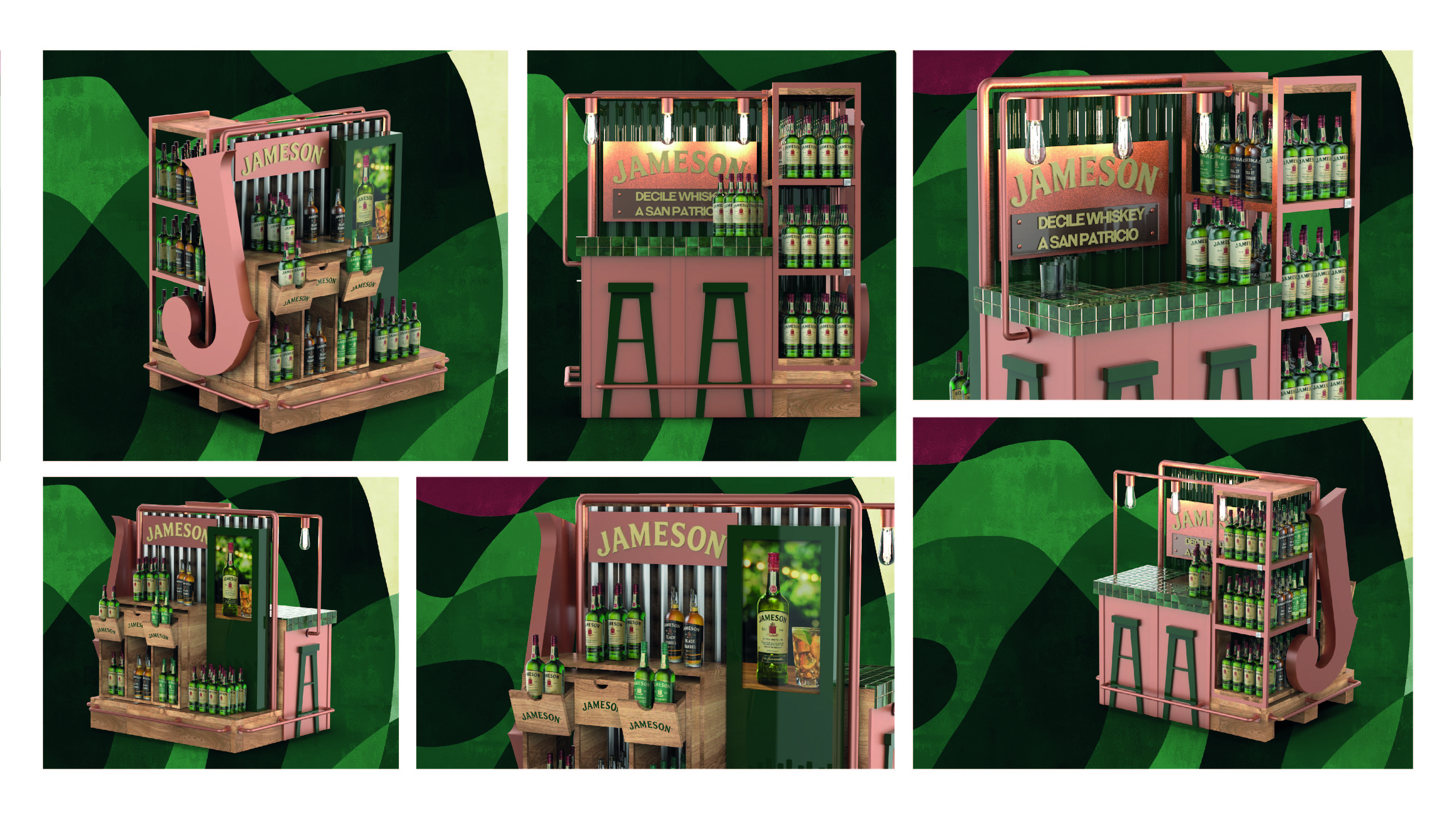 MDF, CHAPA ACANALADA, CORPOREOS Y VINILOS IMPRESOS, CAÑOS, recrean una barra de un bar irlandés, tomando el slogan de Jameson sobre una forma mas descontracturada de acercarse al whisky ( serios pero no tan serios ) Tonos verdes y dorados, la iluminación por medio de vulvos de filamentos le agregan visibilidad de larga distancia y esa sensación de intimidad y coziness que junto a detalles de madera le dan cierto toque rústico e informal. Placas de acrÃlico con gráfica intercambiable permiten darle permanencia a la isla mas allá de la fiesta de san patricio y la incorporación de un photo boot, que durante los fines de semana permite llevarte la tira de fotos con el mood san patricio. Luego el photo booth se reemplaza por una pantalla, que se actualiza hasta el fin de la temporada.