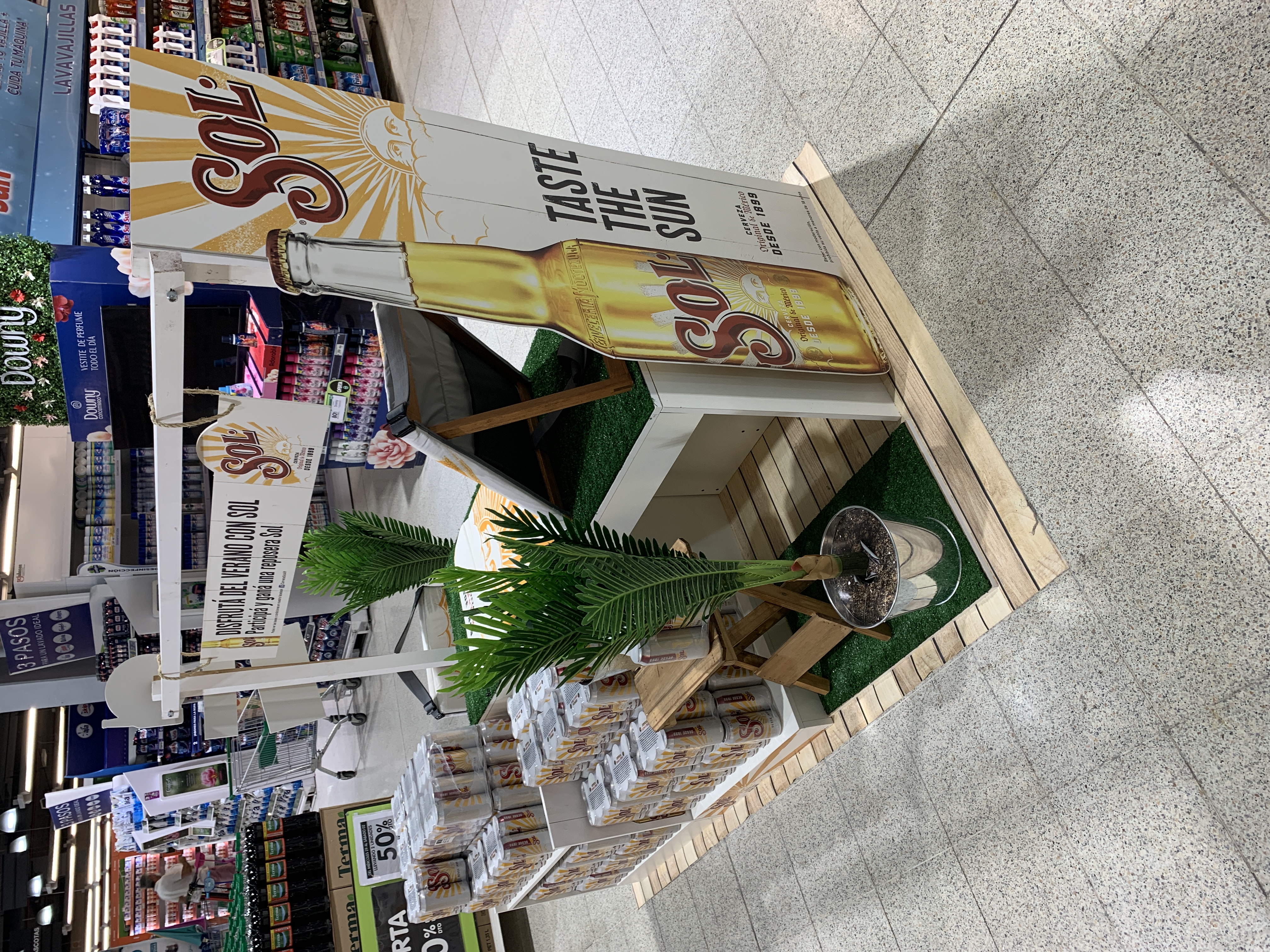 A diferencia de otras cervezas de la categorÃa, SOL no pone su foco en la playa o mar, por lo se decidió que el espacio configure una escenografÃa de verano urbano. Para ello se agregaron elementos como el césped sintético, plantas, un piso deck simil madera enrollable, y una mesa de jardÃn con una frapera metálica para mostrar el producto al lado de la reposera, en situación de consumo.