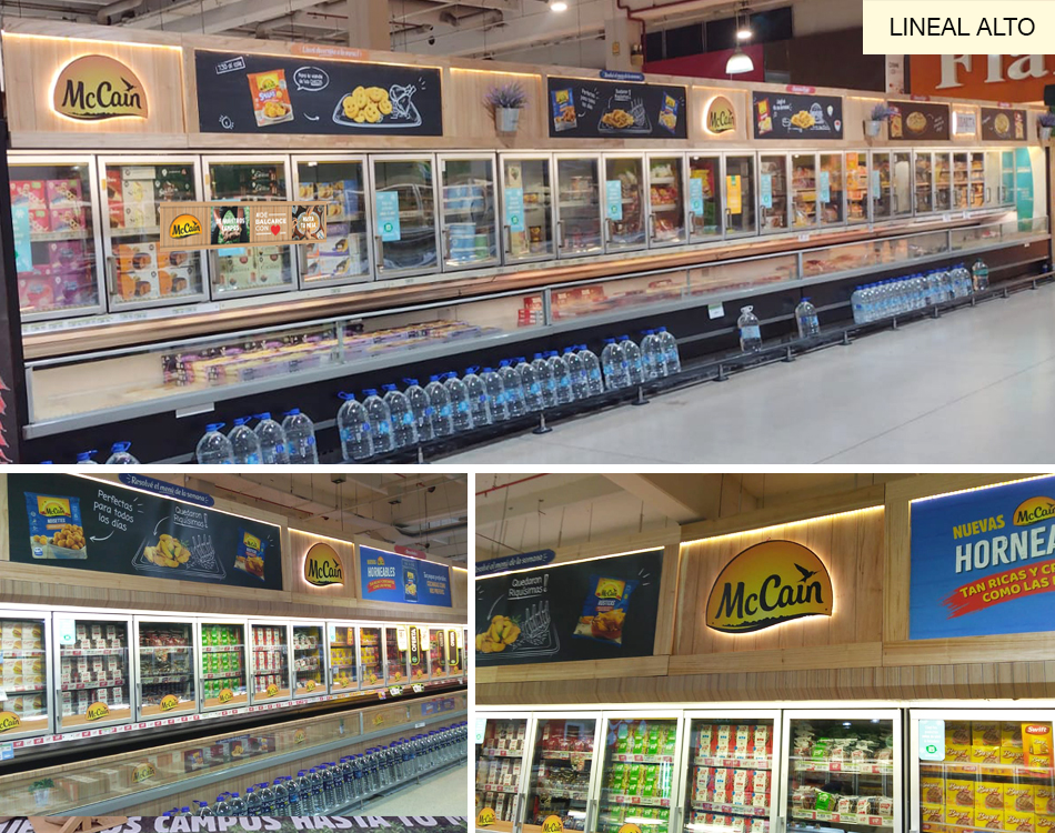 El objetivo planteado fue crear una identidad de marca en la exhibición en el lineal de los freezer de las marcas de Mccain ( papas y pizza sibarita) en las diferentes cadenas de supermercados y en los diferentes formatos de exhibición , como freezer en punteras altas , bajas , islas de diferentes tamaños de 2 , 4 o 6 módulos. A su vez como parte del objetivo fue otorgar atractivo a la exhibición ya que los freezer estandars son muy neutros y de lejos casi no se ve el producto. Se planteo como objetivo destacar la exhibición desde lejos para lograr llamar la atención del shopper a la categorÃa y una vez sobre el freezer trabajar con mensajes o imágenes que incentiven el consume y promuevan la decisión de compra.