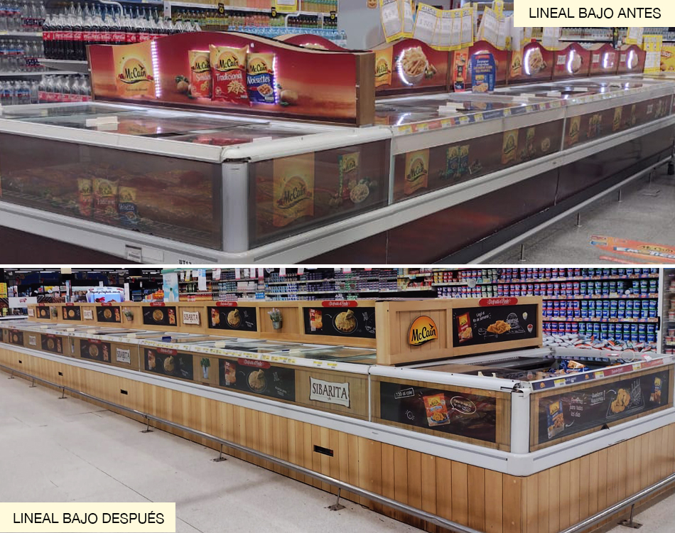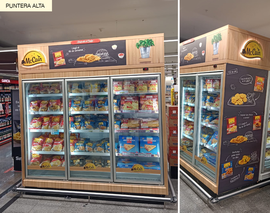 La estrategia planteada contemplo por un lado revestir los frezzer con listones de madera, logos corpóreos con iluminación , y cabezales con las mismas terminaciones . Sumado a frases call to action como: disfruta el finde, llego la diversión a la mesa, e imágenes con estilo pizzara que aluden a situaciones de consumo de los productos. En cada punto de venta se adapto el diseño general a las diferentes situaciones de exhibición, con producción a medida ( islas, punteras altas , bajas o lineales) . a su vez se plantearon dos niveles de calidad , una premium con madera y luz led y otra económica con vinilo y placas de PAI impreso simulando las mismas terminaciones. El proyecto contemplo relevamiento, diseño, producción e instalación en todo el paÃs en COTO, CRF ; Jumbo , walmart, etc.