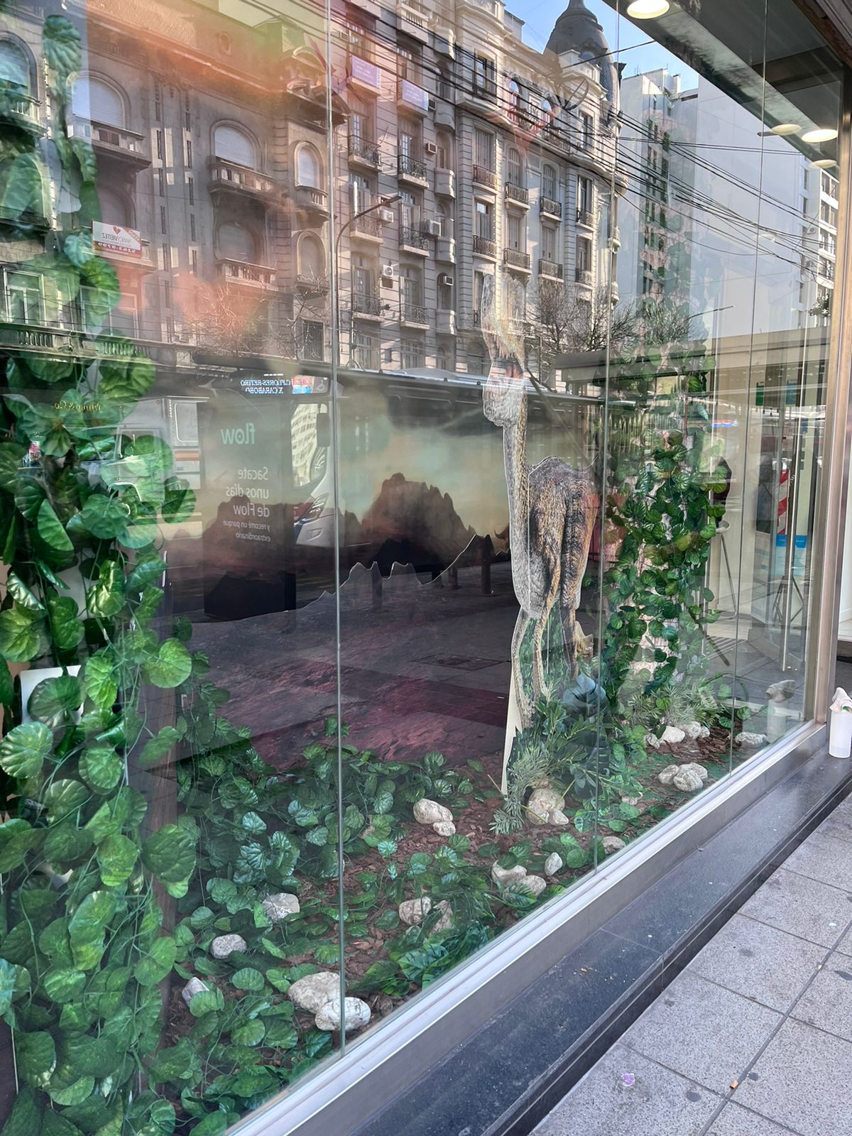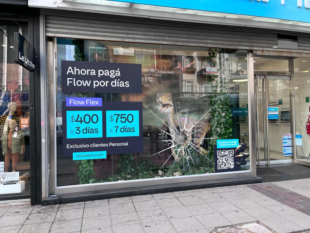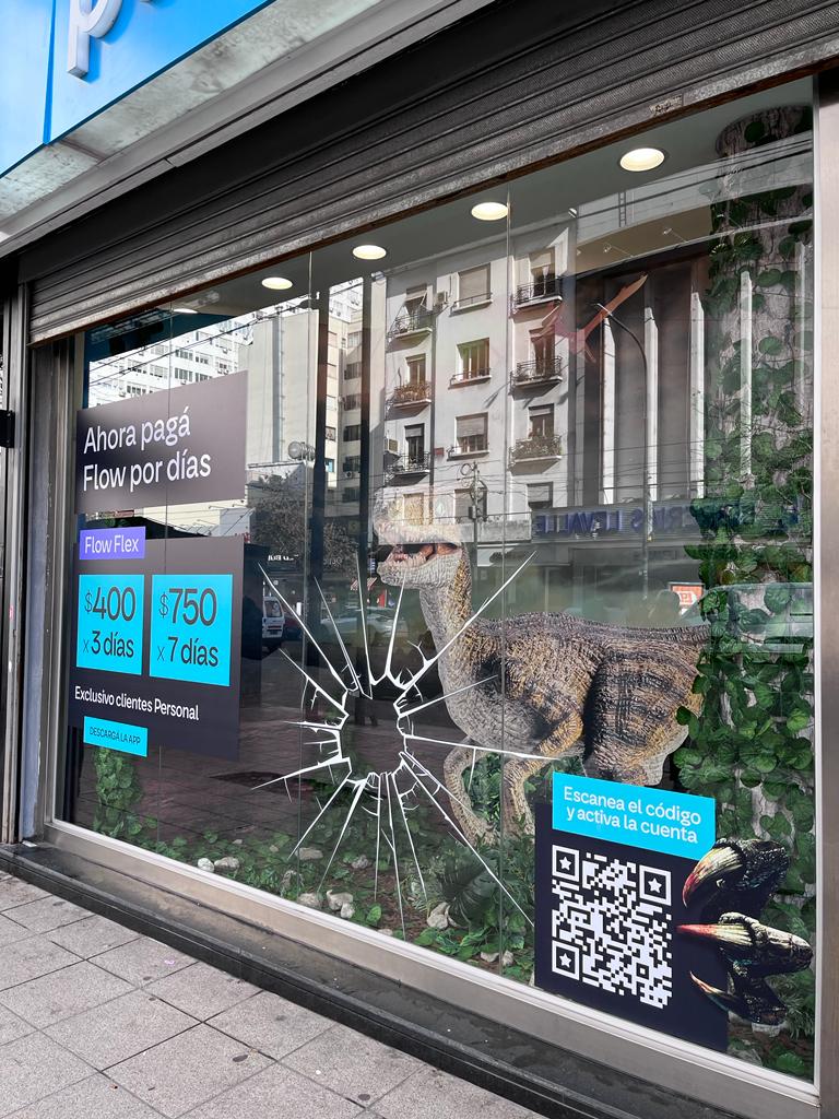 Flow queria comunicar el lanzamiento de la nueva pelicula Mundo Jurasico en su plataforma, querian una vidriera totalmente disruptiva y que tenga gran impacto en el publico que pasaba sobre el local, sentir que estaban los personajes ahi.