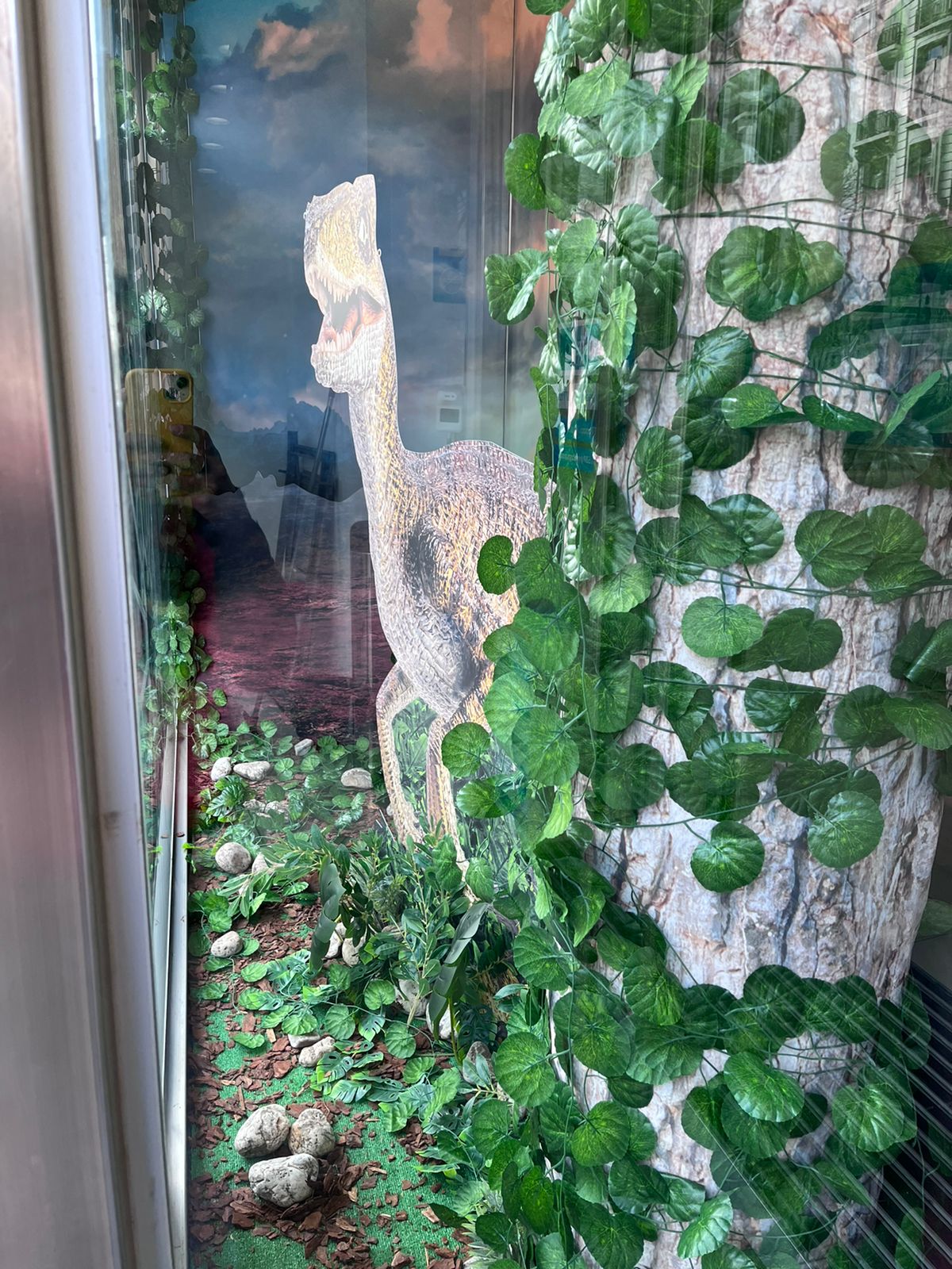 Propusimos simular un vidrio roto con un vinilo clear impreso, y que por detras este el dinosaurio con mas de 200cm de altura listo para salir a la calle.