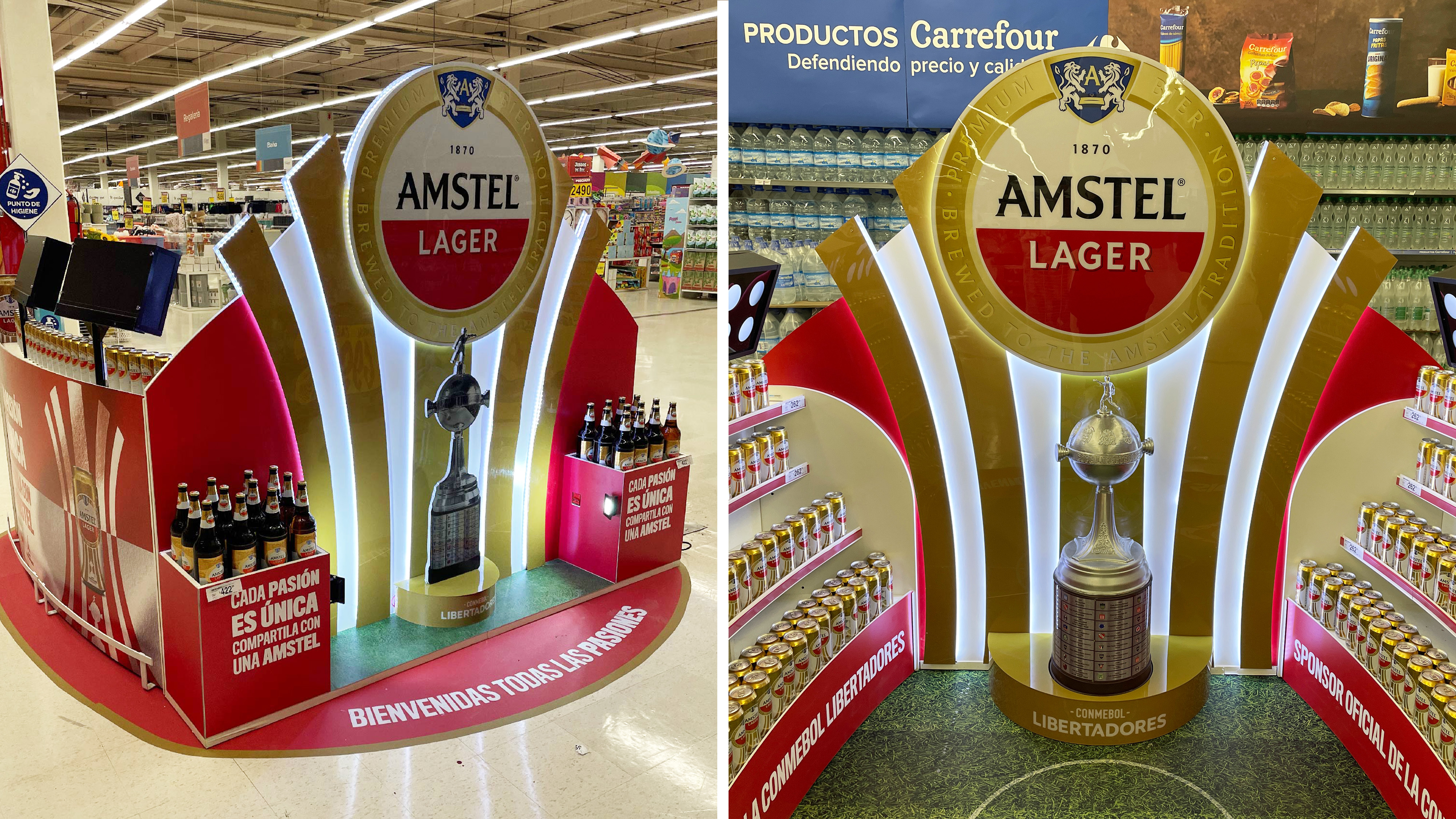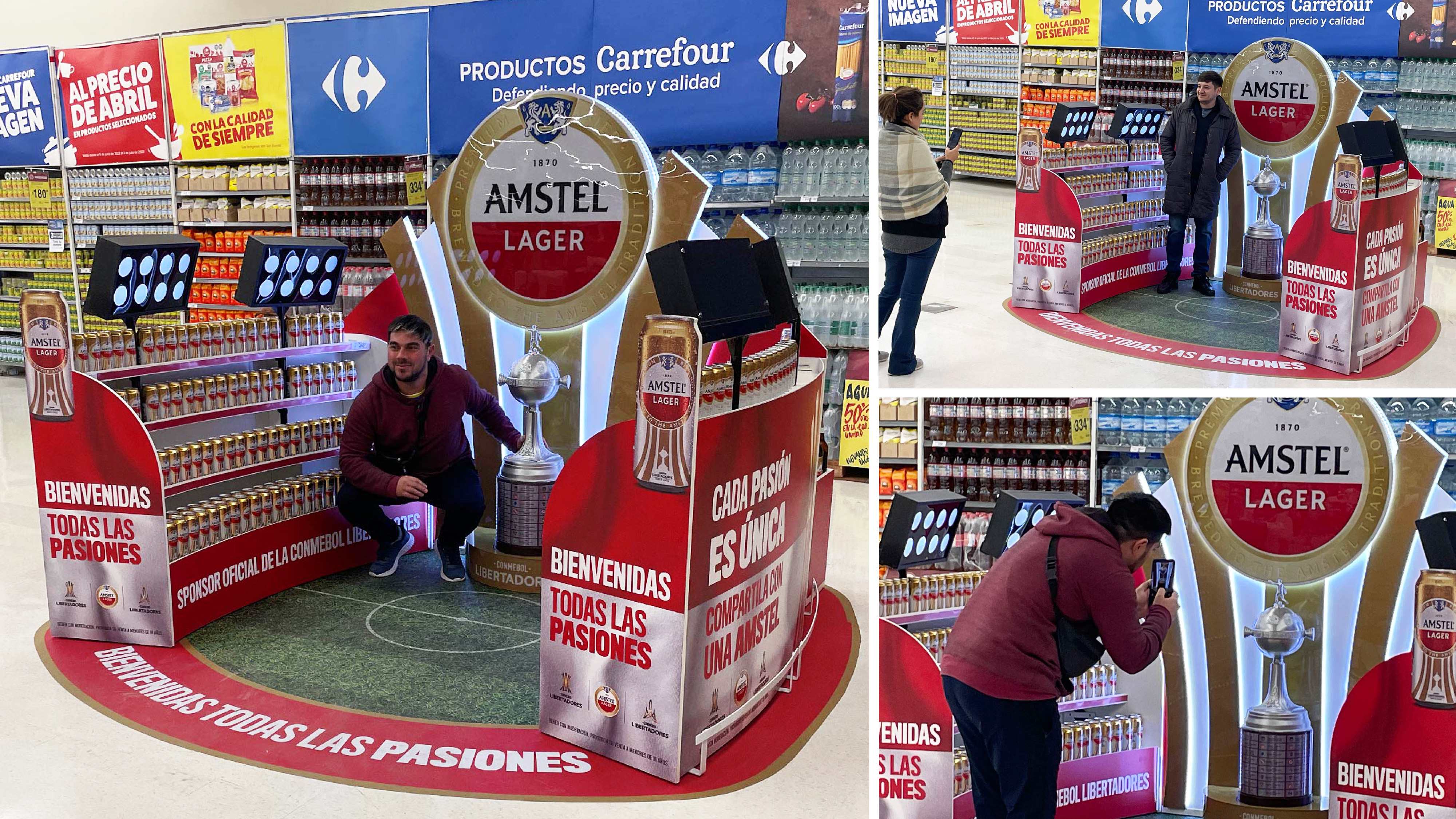El requerimiento del cliente fue crear un espacio WOW que vincule fuertemente al shopper con la cerveza AMSTEL , la edición especial de la lata de cerveza con el evento deportivo de la copa libertadores en el punto de venta. Que llame la atención, logre detener al shopper y que interactúe con el espacio y la marca . A su vez se solicitó que idealmente sea un espacio “ Instagrameable” , es decir que invite al shopper a que espontáneamente se saque fotos en el espacio y las suba a sus redes sociales. Por otro lado se solicitó que sea un espacio bajo de no más de 1,6m y abierto, con un diseño que remita directamente a la temática de fútbol.