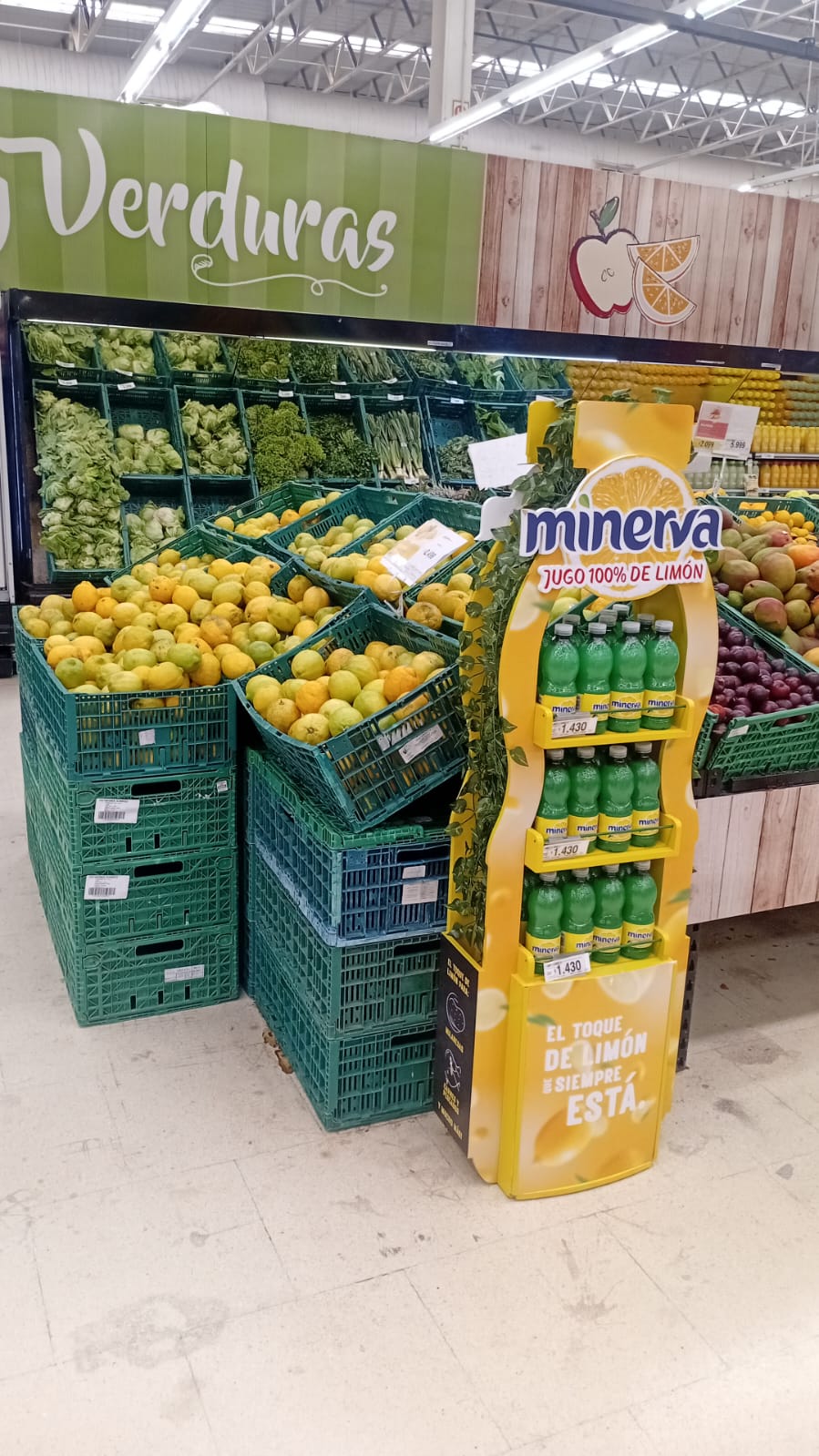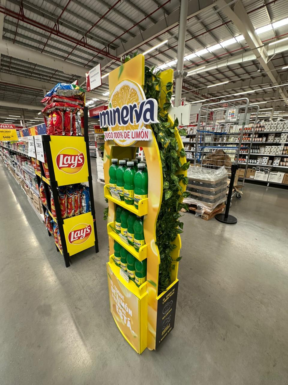 Materialidad: MDF, gráficas en vinilo, plantas artificiales, barandas como cenefas aptas portaprecios, gráficas intercambiables en la base.