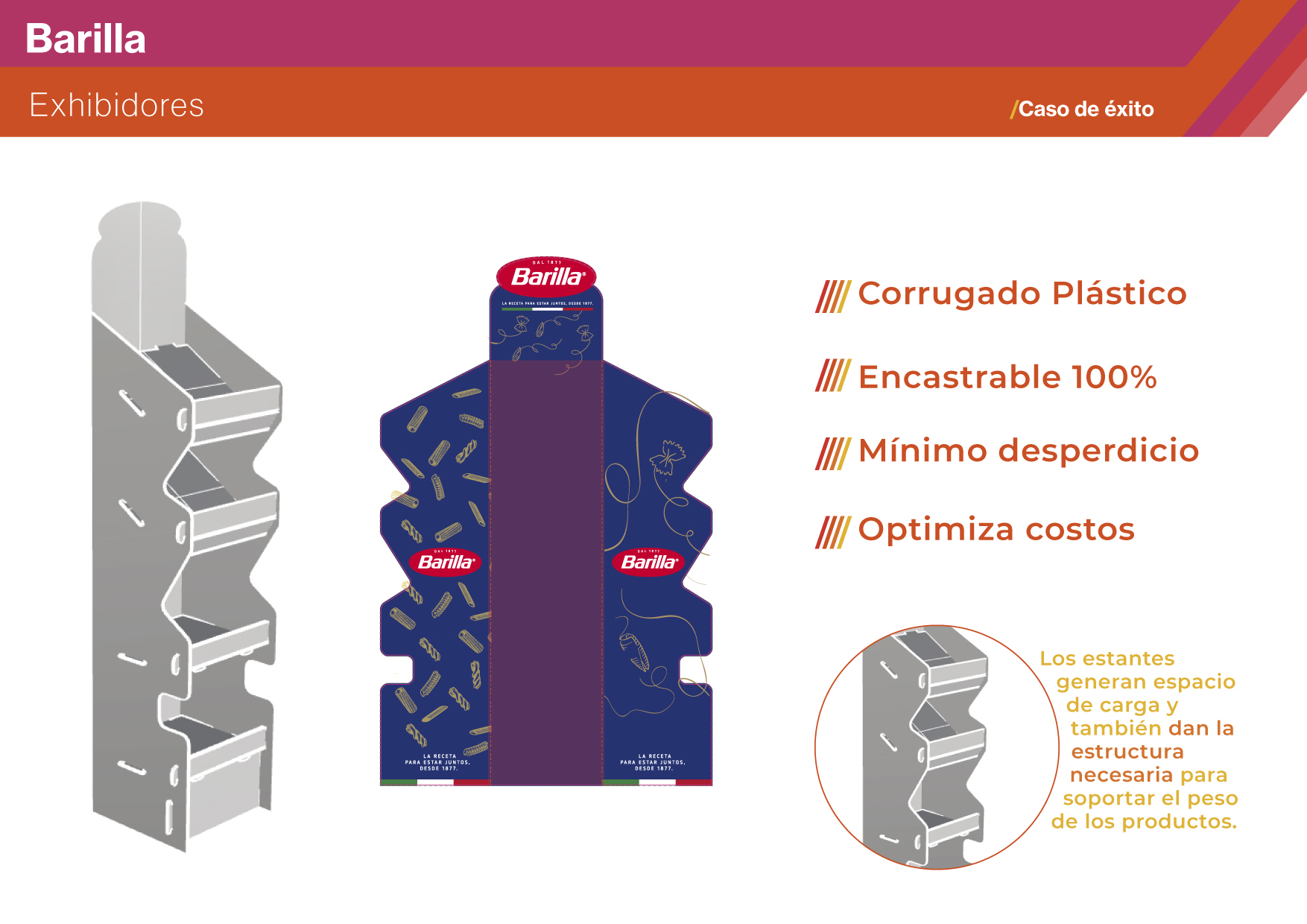 El exhibidor se desarrolló íntegramente en corrugado plástico encastrable con impresión full print, garantizando resistencia, durabilidad y un montaje sencillo. Su diseño limpio y ordenado, con estructura escalonada, refuerza la percepción de cuidado y detalle propios de una marca premium. Los estantes optimizan la carga y sostienen el peso de producto, mientras que los cantos ocultos y la gráfica envolvente aseguran terminación prolija. La paleta en azul institucional de Barilla, aplicada con máxima precisión, consolidó el carácter gourmet y exclusivo de la marca. El resultado fue un exhibidor funcional y a la vez sofisticado, alineado con la identidad de un producto de alta gama.