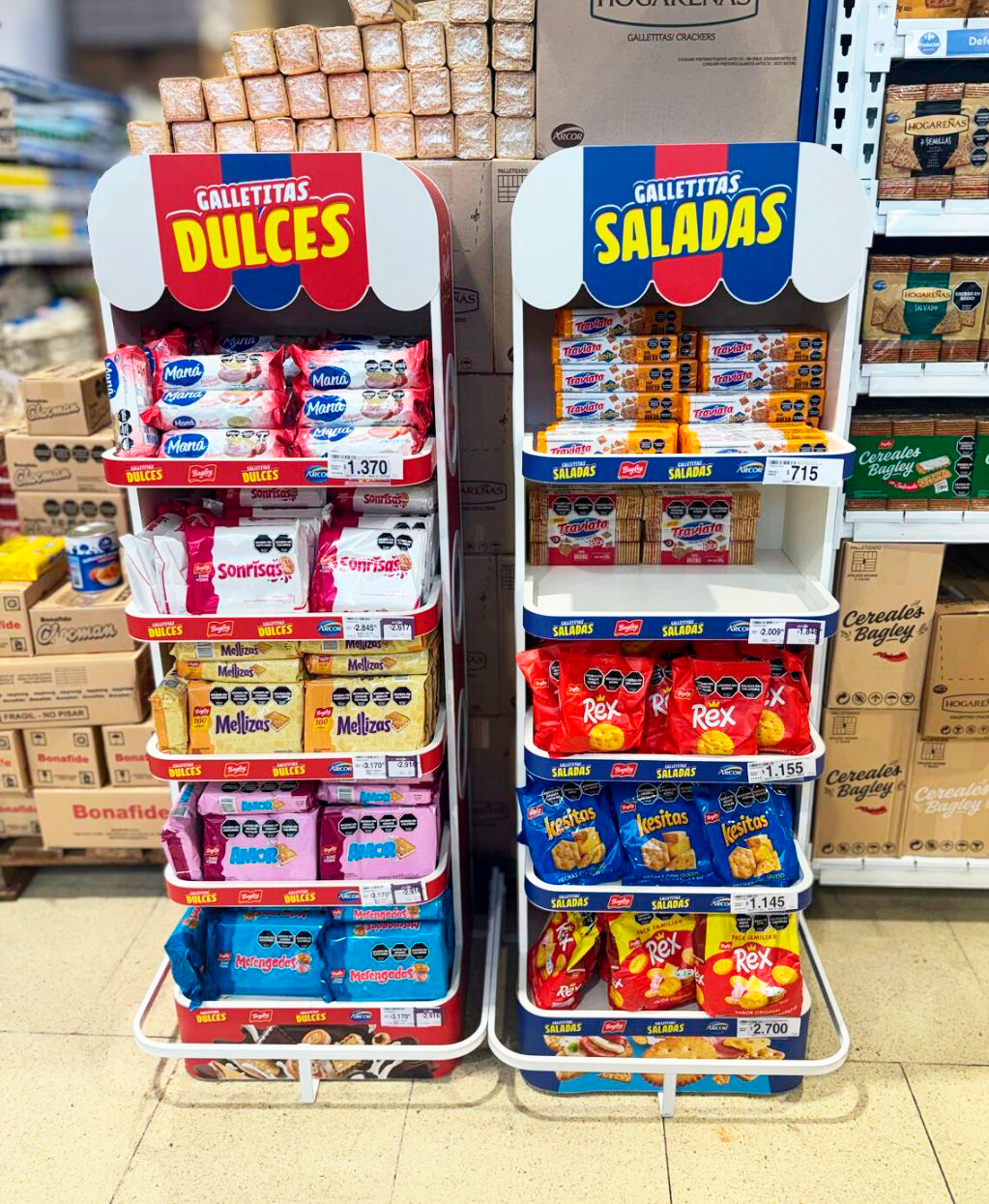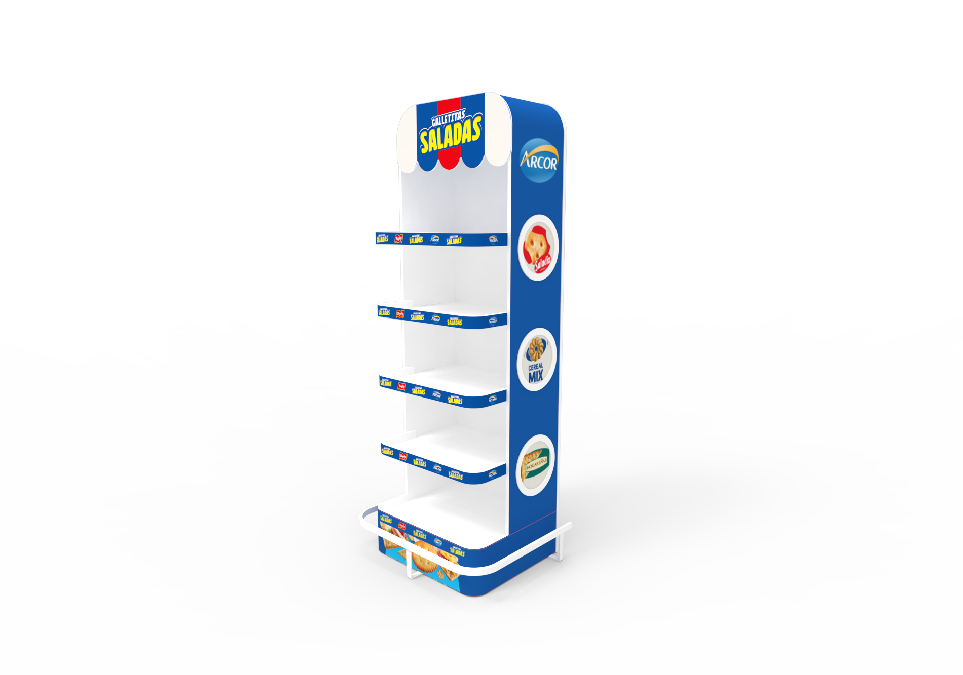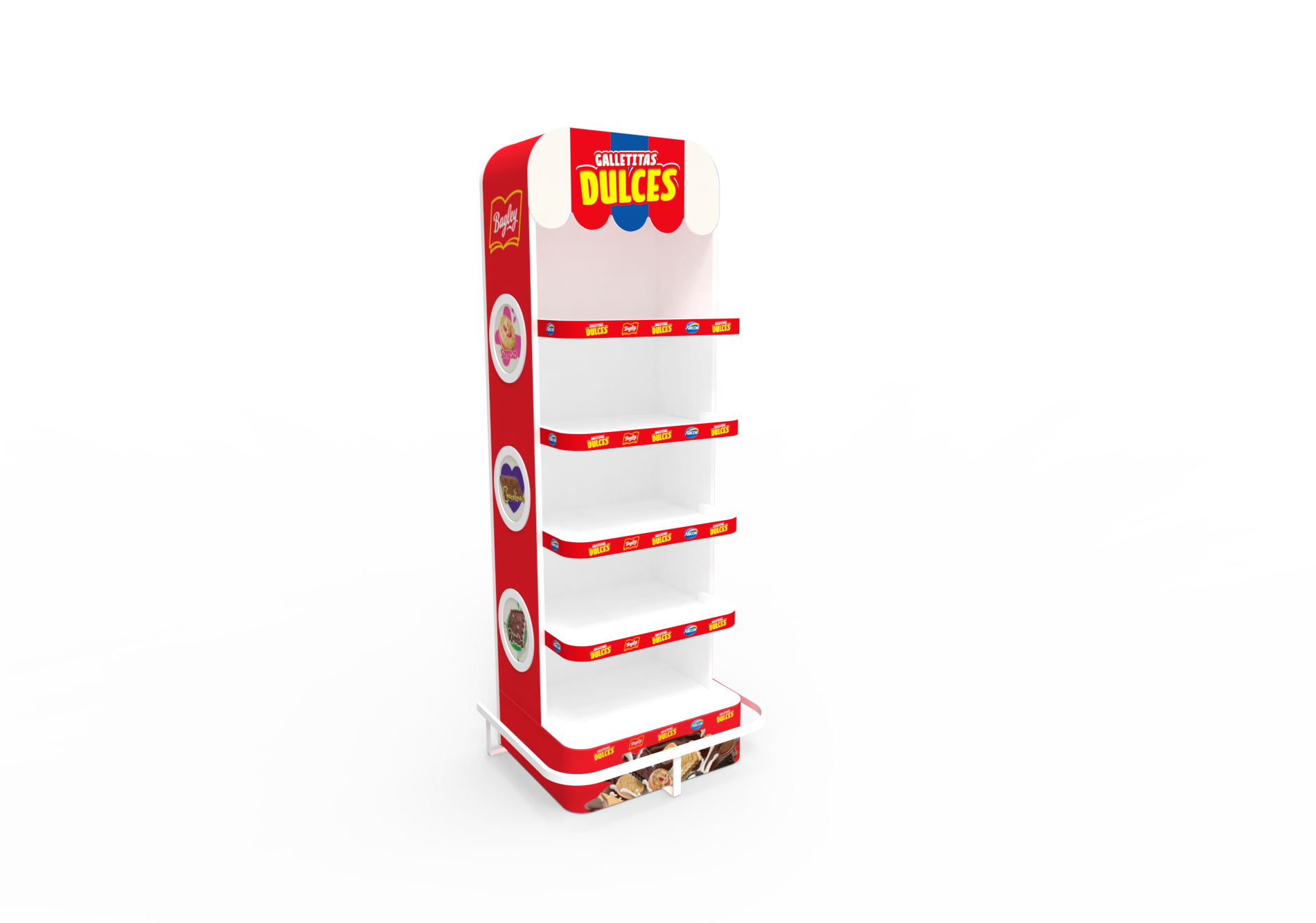 Este exhibidor de pie institucional para galletas dulces y saladas de Grupo Arcor está inspirado en la estética de un pequeño kiosco con toldo, pensado para atraer miradas y ordenar el surtido con claridad entre galletitas saladas y dulces.