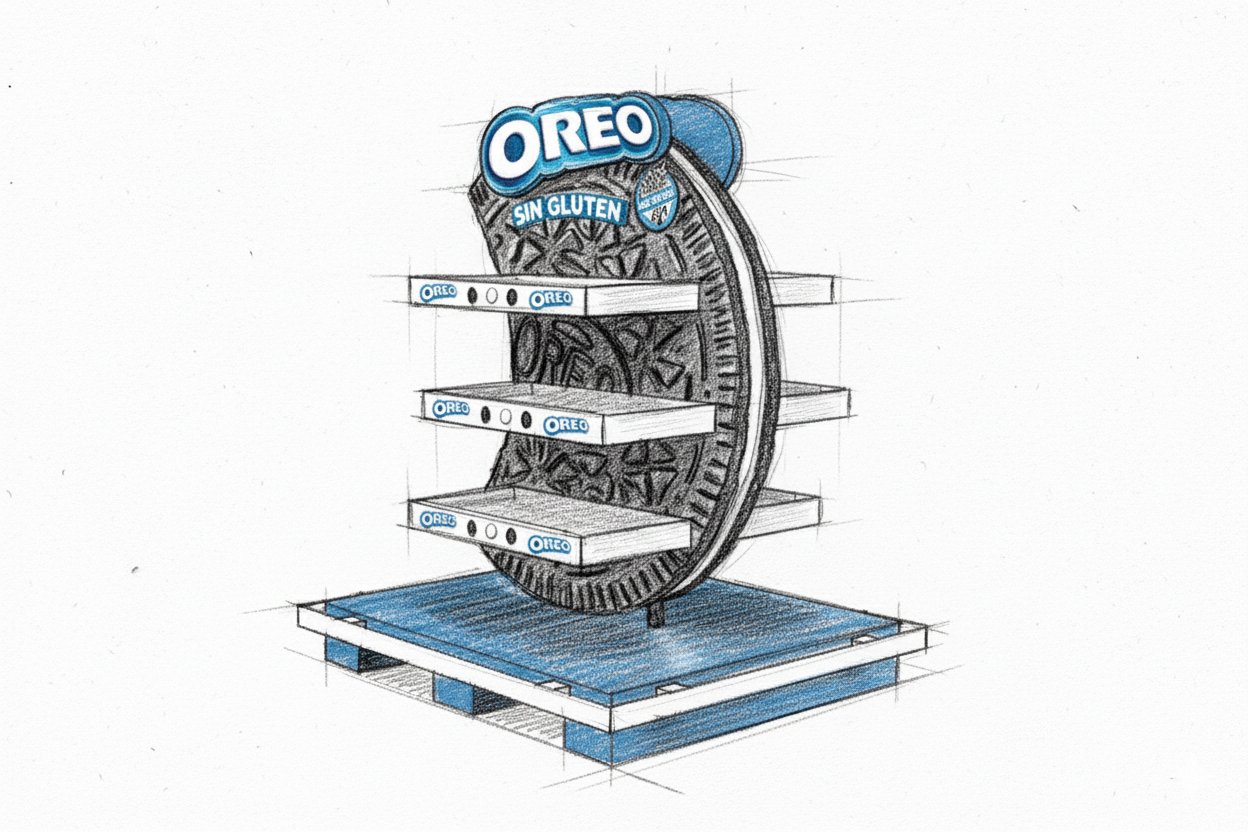 La estrategia se centra en usar los recursos gráficos de la galleta como hilo conductor principal del diseño. El objetivo es crear una exhibición secundaria fuera de la góndola tradicional (donde suelen agruparse los productos sin gluten) para maximizar el espacio y aumentar el tráfico.