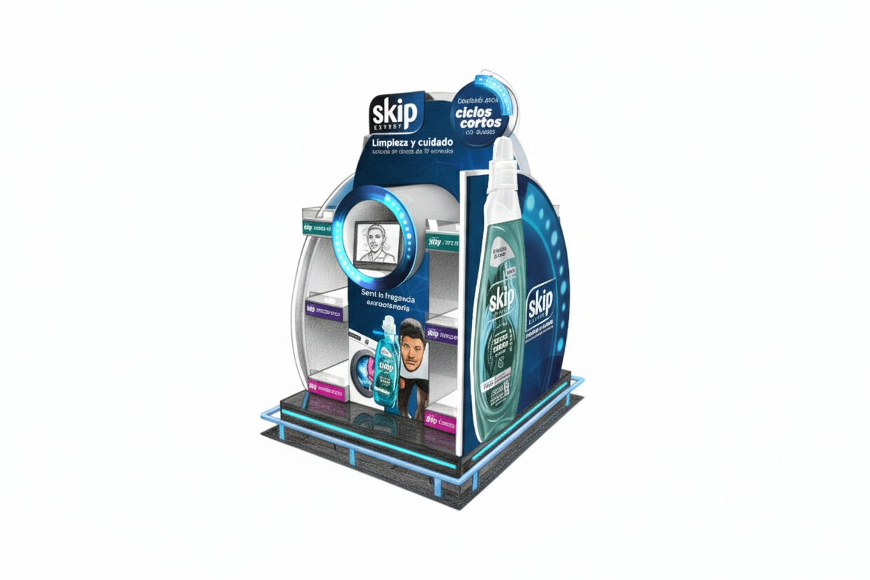 SKIP Tendria un lanzamiento en julio del 2025, revolucionando los ciclos de lavado a nivel mundial. Es EL lanzamiento del año y para ello creó un brief para el desarrollo de una campaña integral 360 y de POP para el punto de venta que abarcaba todo el scope del path to purchase, con un claro objetivo, romper el status quo en jabones para la ropa, incluyendo a la celebrity Housain Violt como embajador de la marca haciendo foco en el poder de limpieza y la velocidad, dejando la ropa increible aún en el ciclo mas corto de lavado. Por eso cada pieza tenía que transmitir tecnología, innovación y destacar el nuevo pack transparente.Dentro del brief se hacia especial en un elemento, la isla de impacto que la idea era que sea un espacio WOW en el tamaño de un pallet y con carga de producto.