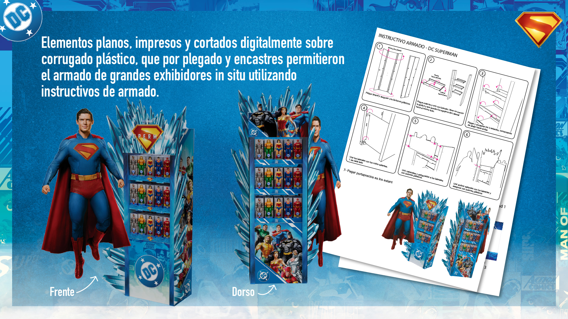 Se desarrollaron kits de elementos planos y livianos, impresos y cortados digitalmente sobre corrugado plástico, que por plegado y encastres permitieron el armado de impactantes displays in situ.