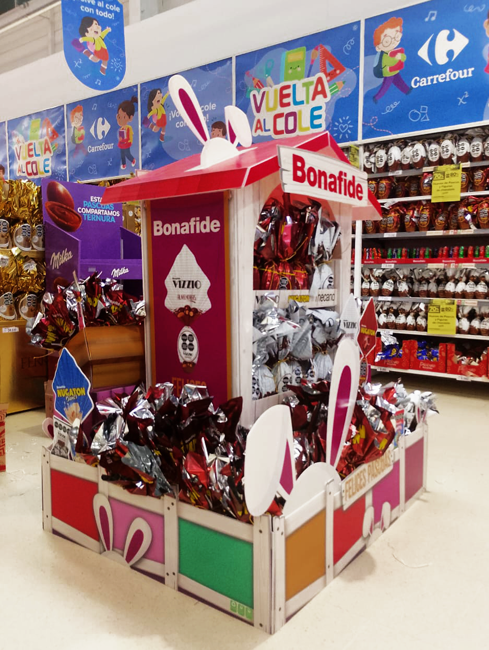 Se utilizo el KV de la marca para la propuesta de diseño, generando todo un desafío escénico apelando a contar la historia sobre la búsqueda del huevo en la casita de pascuas de la marca. La exaltación de recursos como los gigantismos de los huevos y las siluetas de los conejos recrearon la dinámica mas allá de la parte del desarrollo industrial q delinea la escena casa.