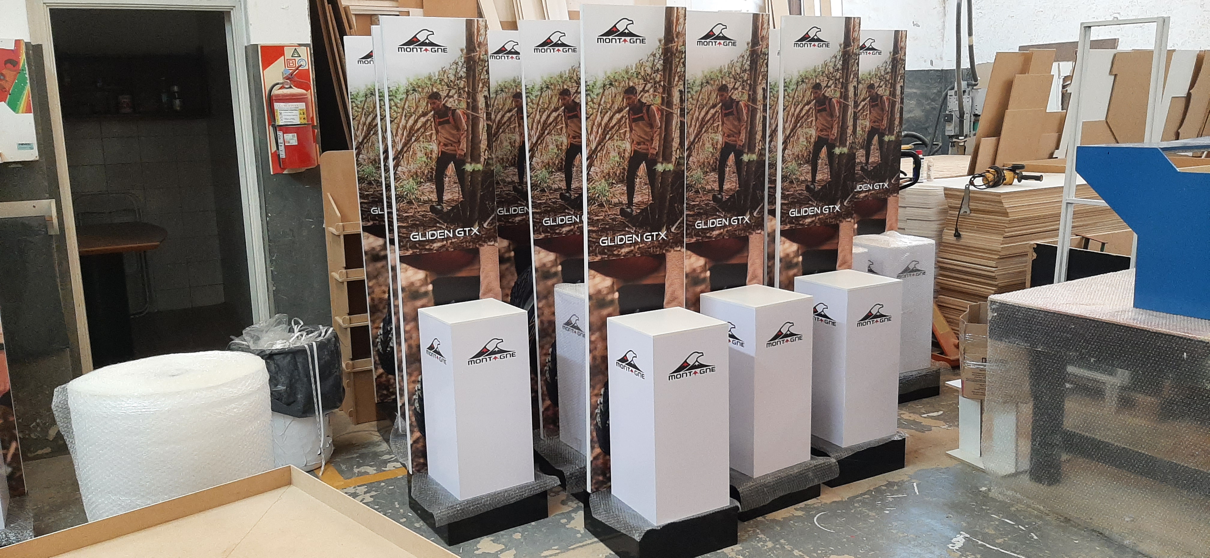 Los materiales utilizados en este caso fueron variados, principalmente estructura de caño a modo de bastidor, revestido en pai impreso en cama plana de ambos lado de la estructura, para llamar la atención en altura desde varios puntos del local. En la parte inferior de esta estructura, se diseñó una base laqueada negra de mdf, para colocar sobre ésta, un totem blanco (logrando así, el contraste de color y llamando la atención del shopper) a fin de colocar el calzado en la parte superior de este totem, elevándolo a una altura de la mano y proporcionando facilidad en el agarre.