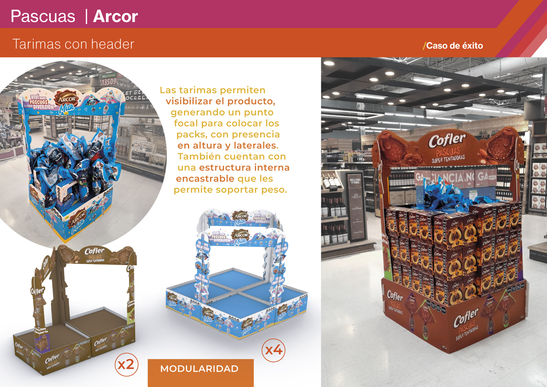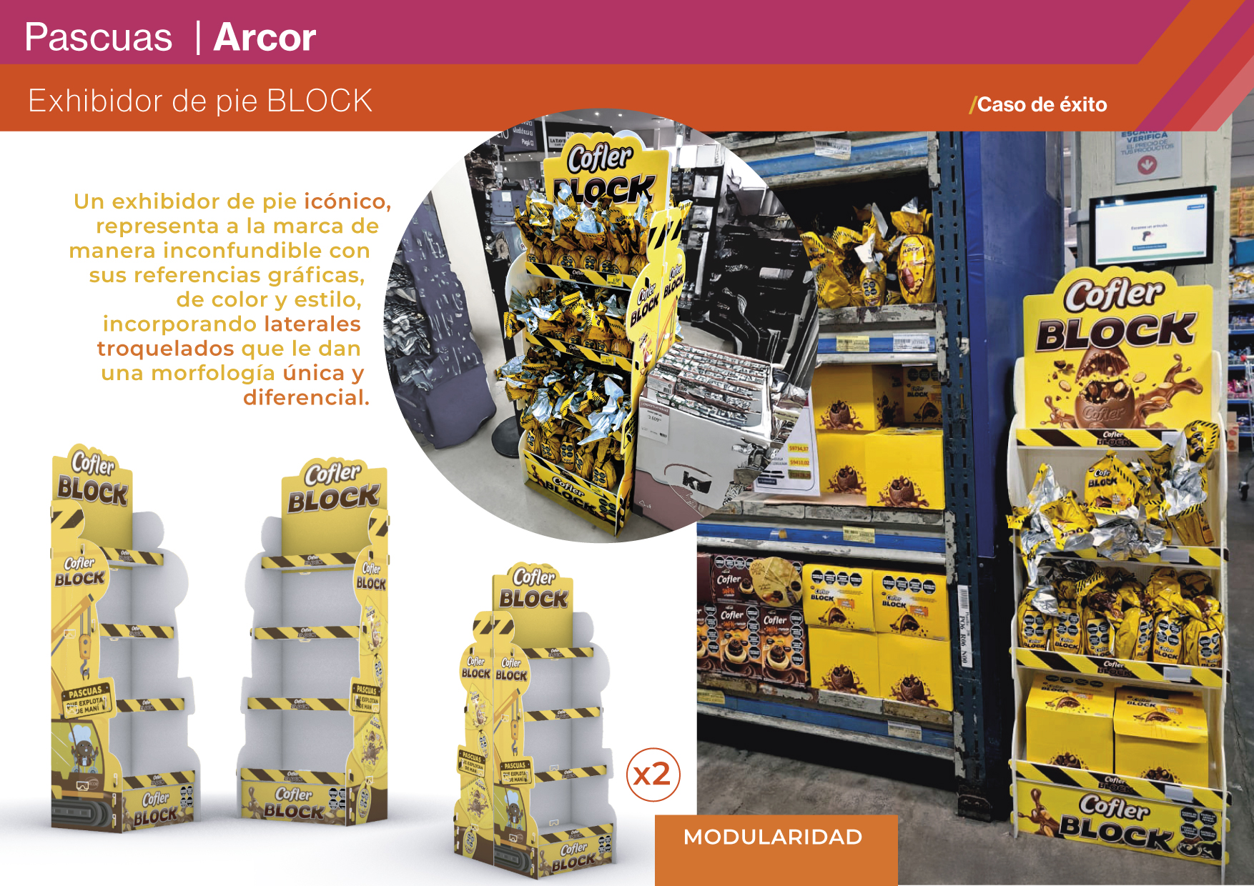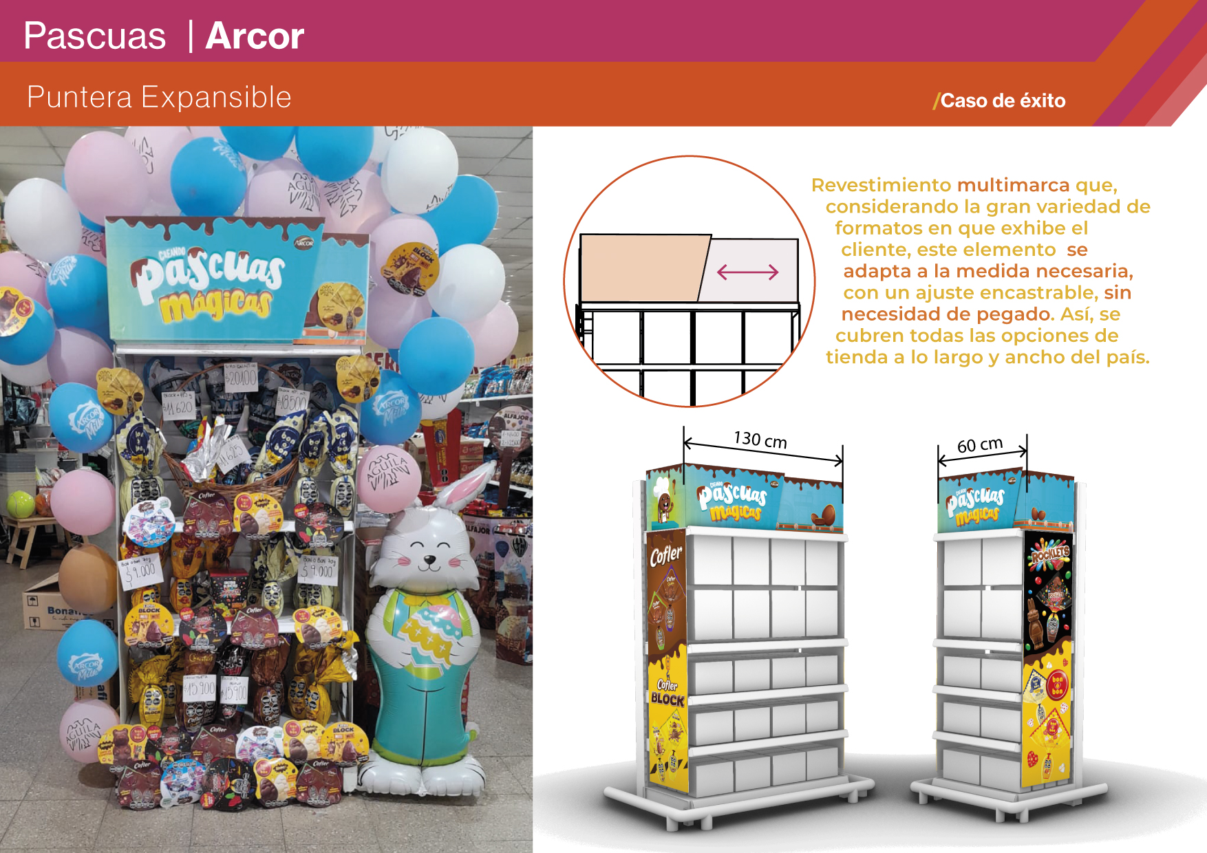El desafío fue crear una propuesta integral de exhibición para Pascuas, capaz de adaptarse a distintos formatos de retail con elementos específicos por marca y recursos compartidos de comunicación. El proyecto tuvo un enfoque multimarca, abarcando Bon o Bon, Cofler, Milk, Block y una puntera expansible que transmitía el concepto de Pascuas en conjunto. El cliente buscaba una solución diferencial en un momento de alta competencia, que ordenara la exhibición, incentivara la compra espontánea y posicionara la idea de “para regalar y compartir” como parte central de la celebración. Los objetivos fueron destacar las marcas, generar visibilidad inmediata y ofrecer una experiencia festiva y atractiva que reforzara la conexión con la temporada.