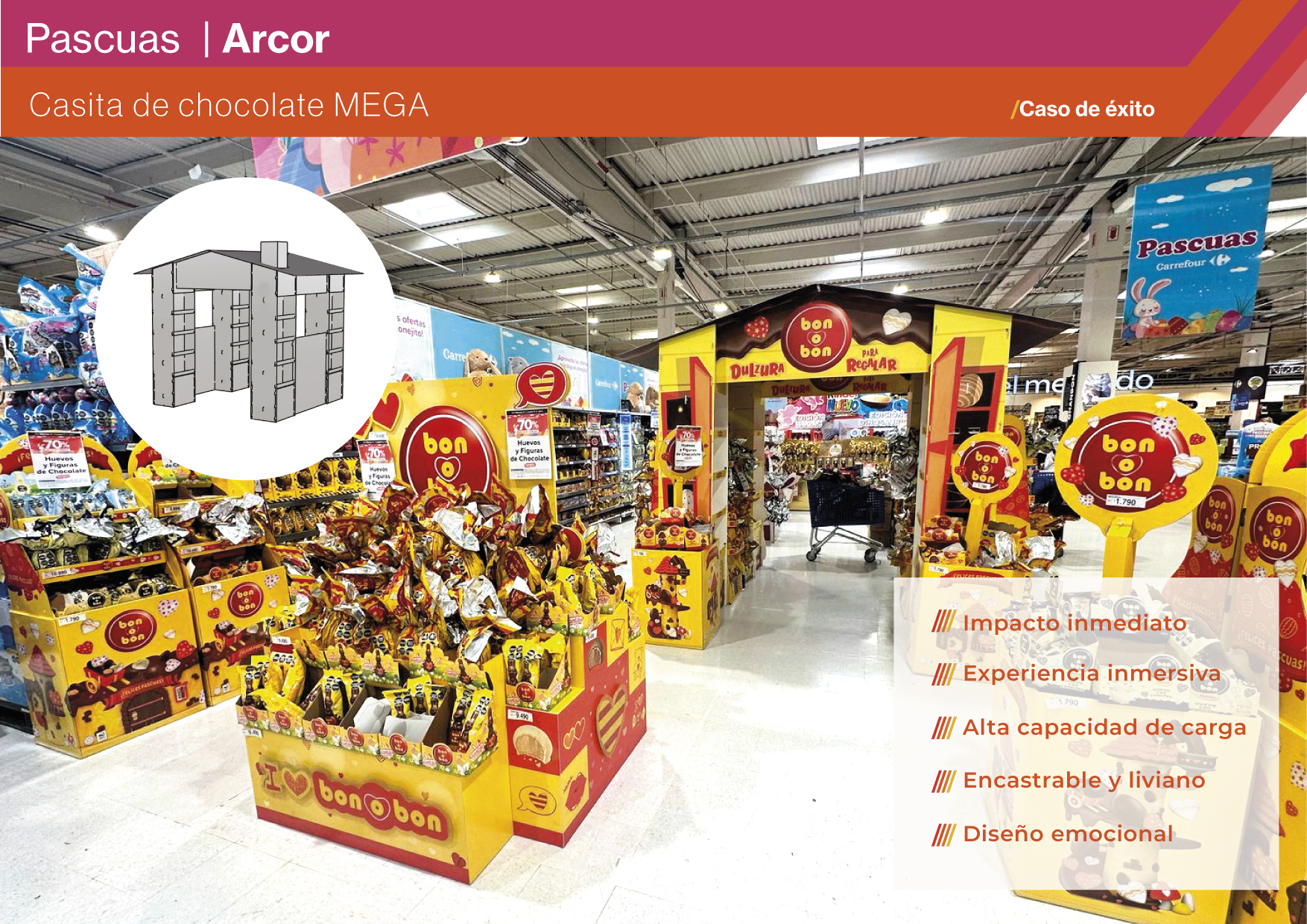 La campaña alcanzó una amplia cobertura territorial, llegando a múltiples formatos de tienda en todo el país con una exhibición consistente y poderosa. La casita MEGA se transformó en un imán visual y emocional, reforzando la asociación entre Pascuas, dulzura y las marcas de Arcor. La propuesta generó orden en la exhibición y máxima visibilidad de los productos, incentivando la compra espontánea y mejorando la experiencia del shopper. Además, al utilizar elementos que se arman directamente en el PDV, la logística se optimizó: las piezas viajaron desarmadas, ocupando menos espacio, reduciendo costos y facilitando la distribución masiva. El resultado fue una ejecución memorable y eficiente, que potenció la presencia de Arcor en la fecha más dulce del calendario.