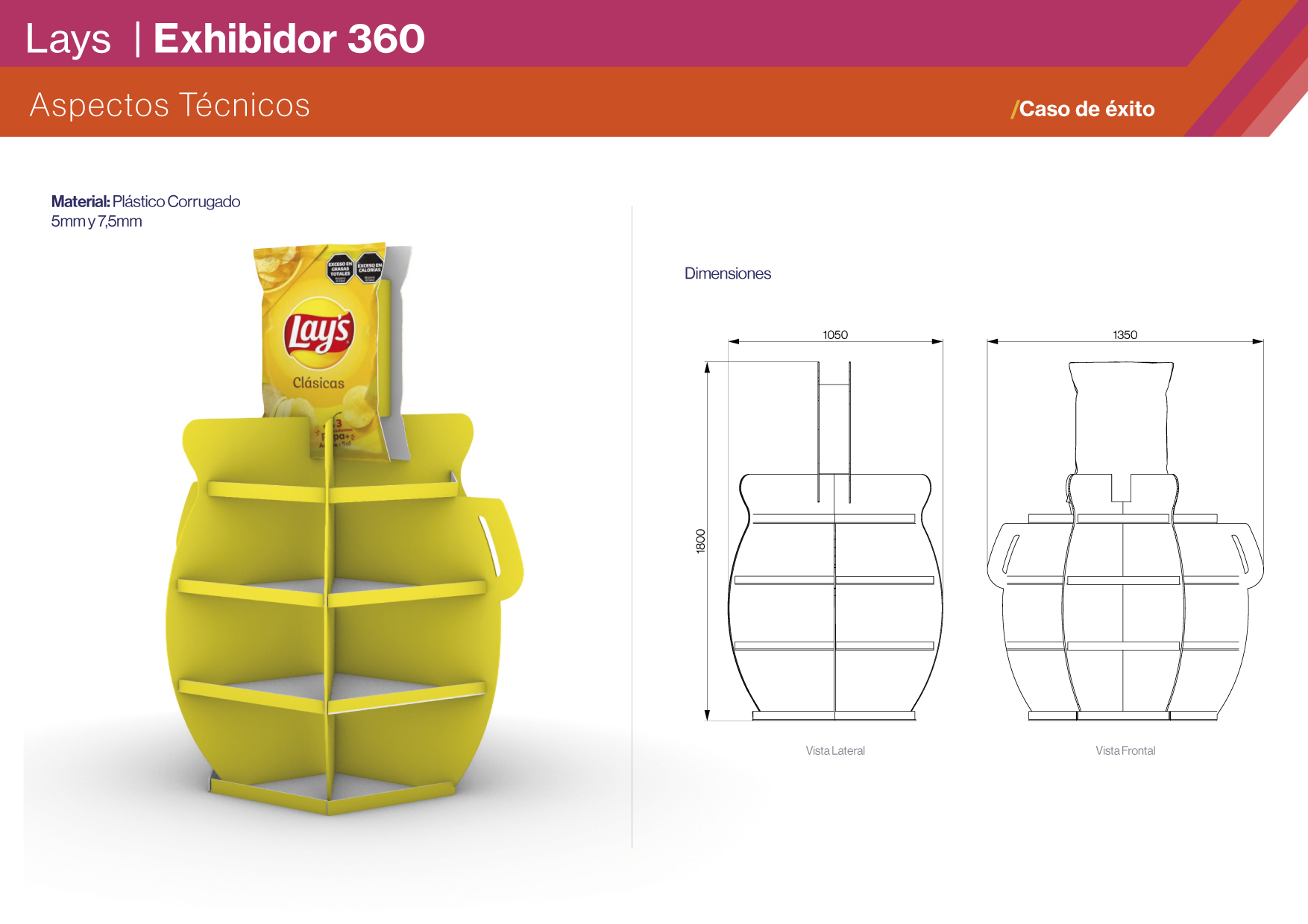 El exhibidor se construyó en corrugado plástico de 5 y 7,5 mm, impreso UV y diseñado para un montaje sencillo en el punto de venta. Su estructura robusta y envolvente asegura alta capacidad de carga, mientras que el formato 360° garantiza visibilidad desde todos los ángulos. El diseño reforzó la identidad de marca a través del uso del color amarillo característico y de la gráfica de campaña, vinculando Lay’s con fútbol, asado y el ritual de compartir. El desarrollo priorizó modularidad y practicidad logística, logrando un exhibidor fácil de transportar, instalar y replicar a gran escala, con una ejecución consistente y prolija en cada PDV.