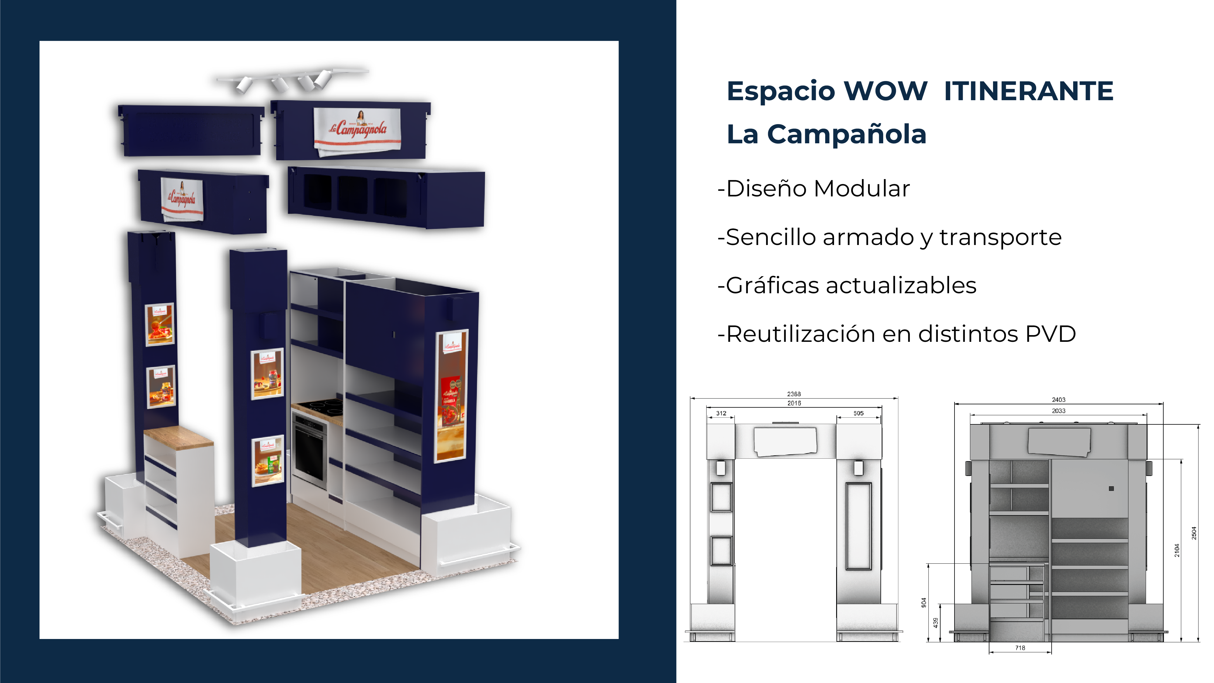 Desarrollado modularmente con estructuras de mdf routeadas, que permiten armado y transporte sencillo para su utilización en distintos PDV.