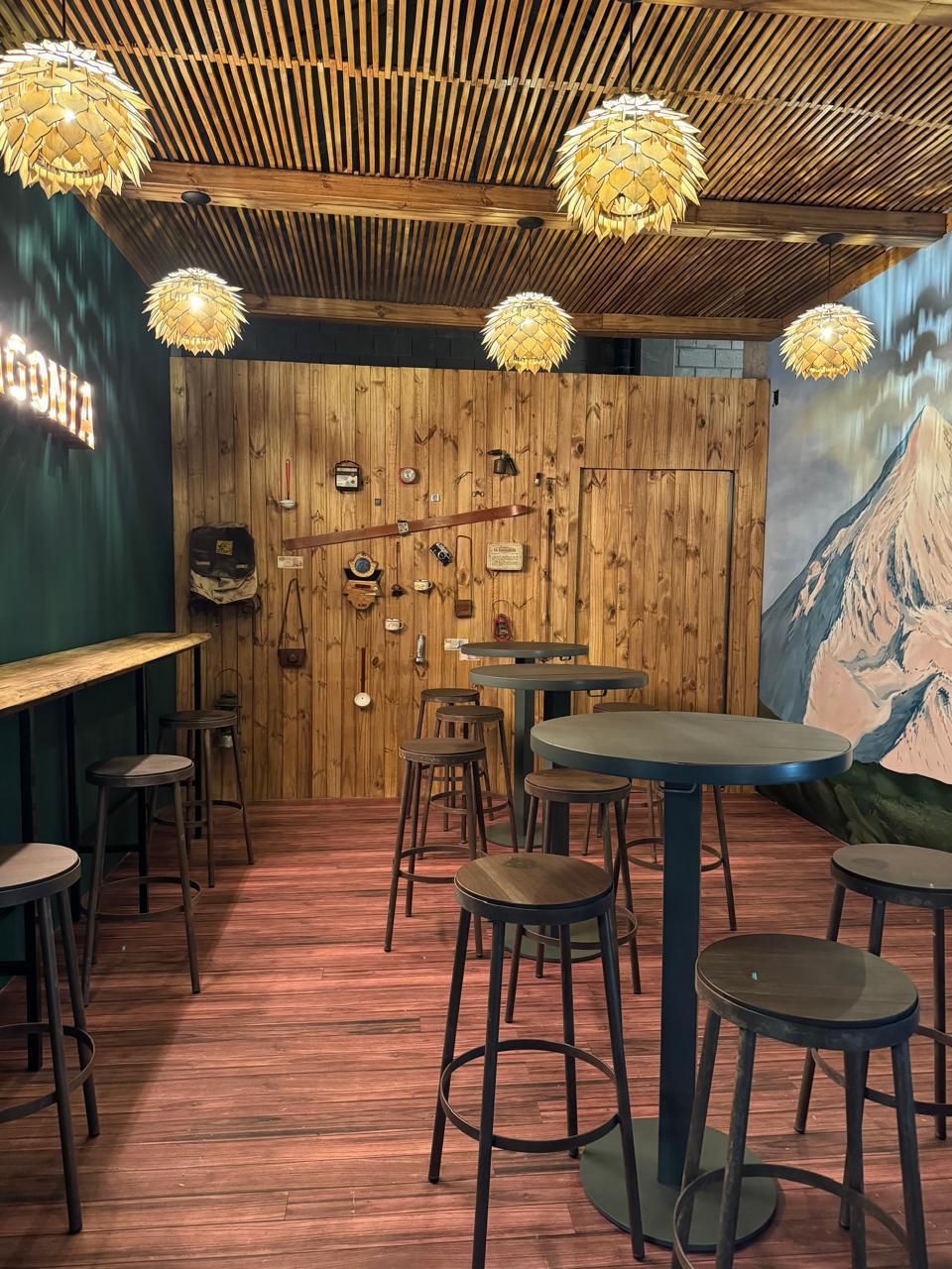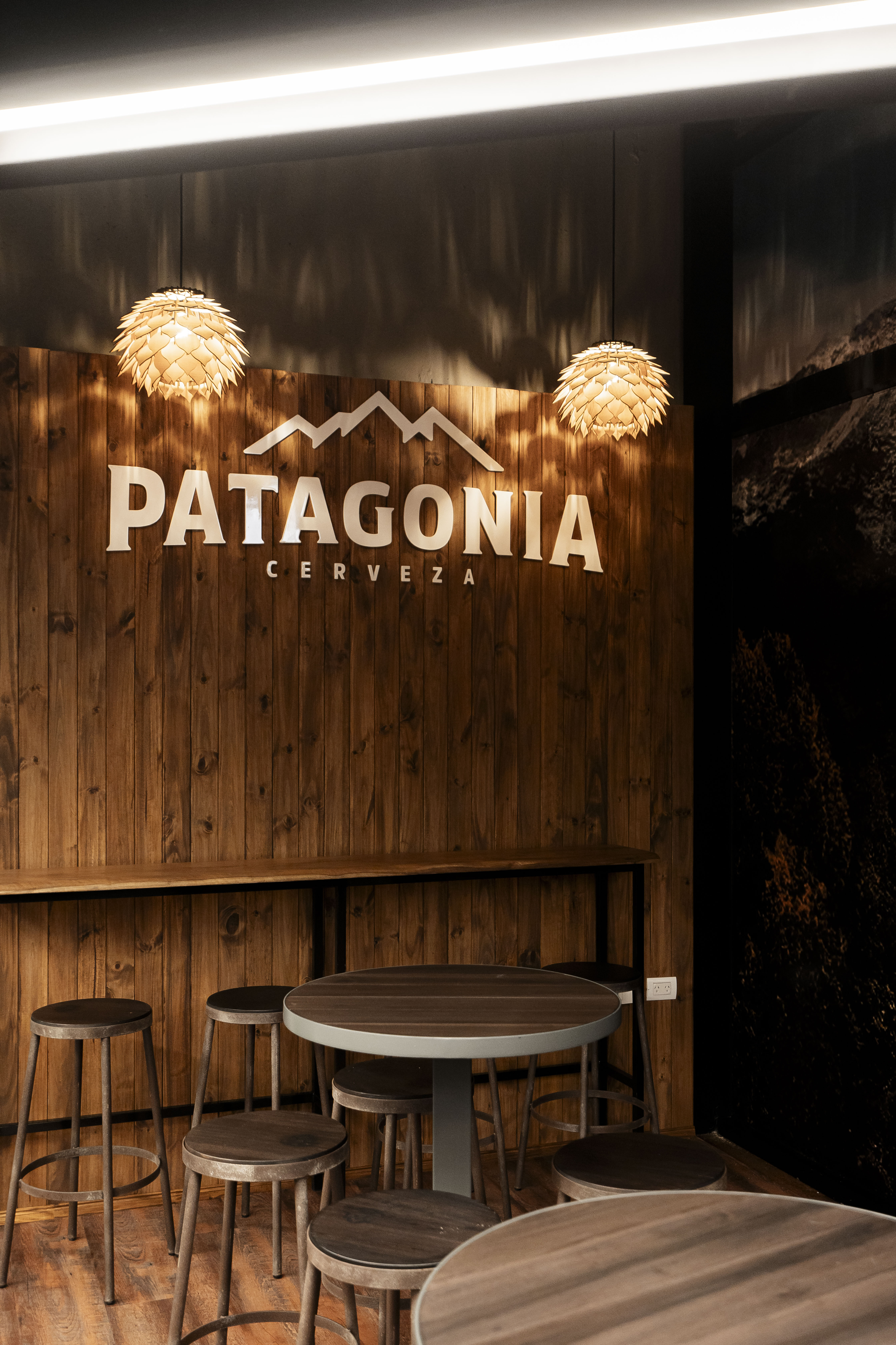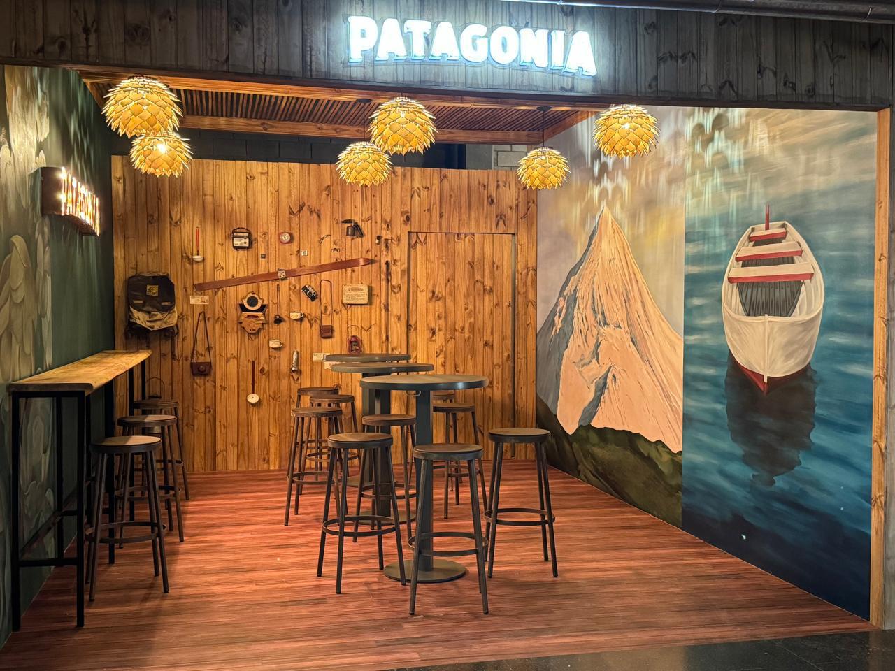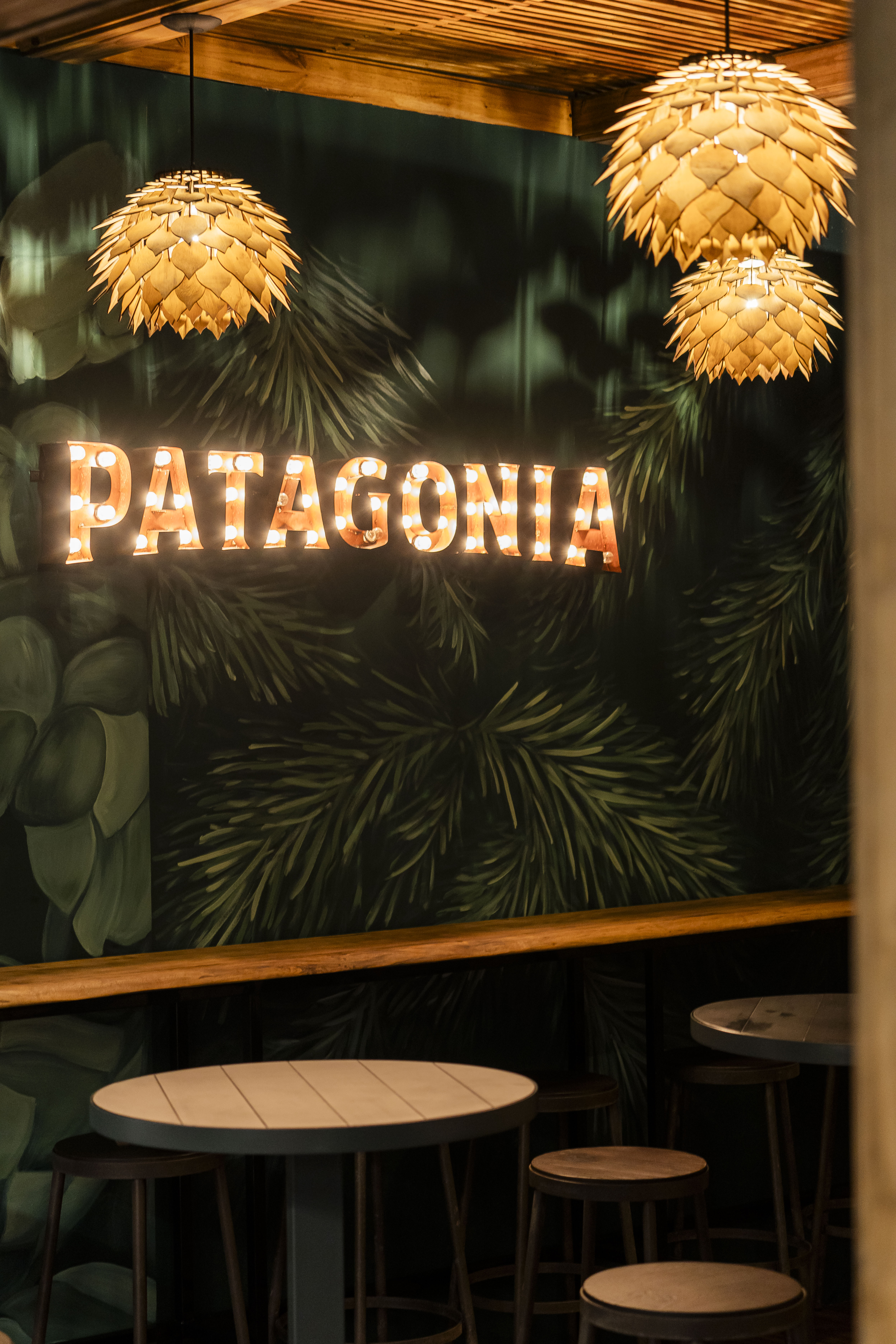 Materialidad: madera Kiri, iluminación con lámparas de filamento cálidas, aplicación de cobre, xilografías, murales y mobiliario de la marca, pantallas, revestimientos de pisos de madera, carteles corpóreos backlight.