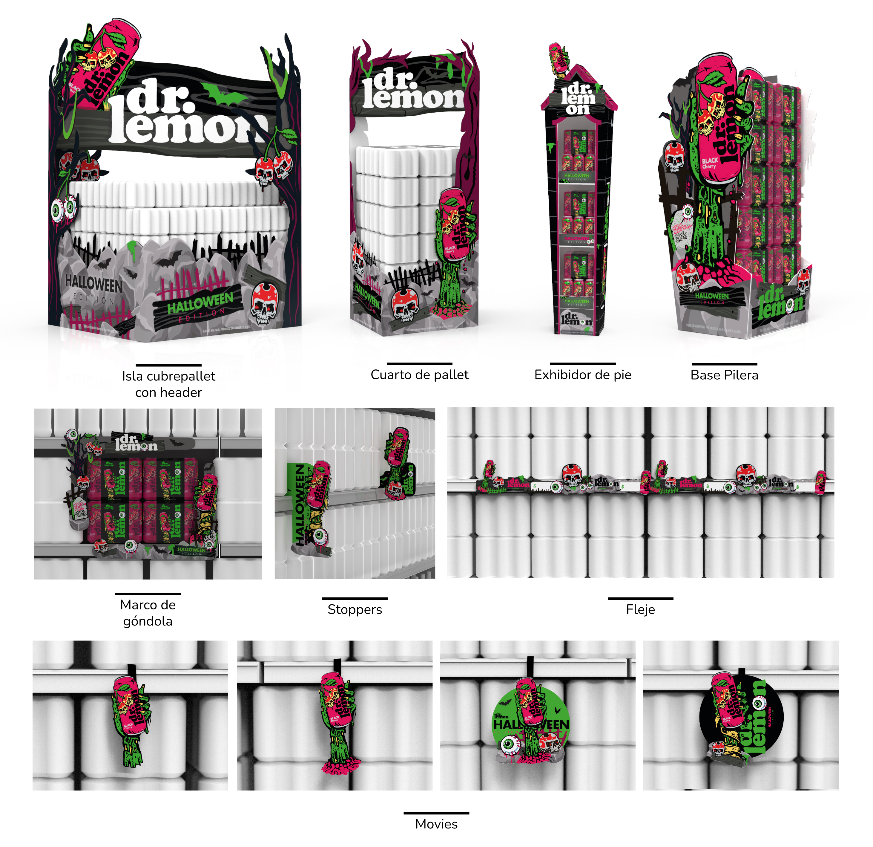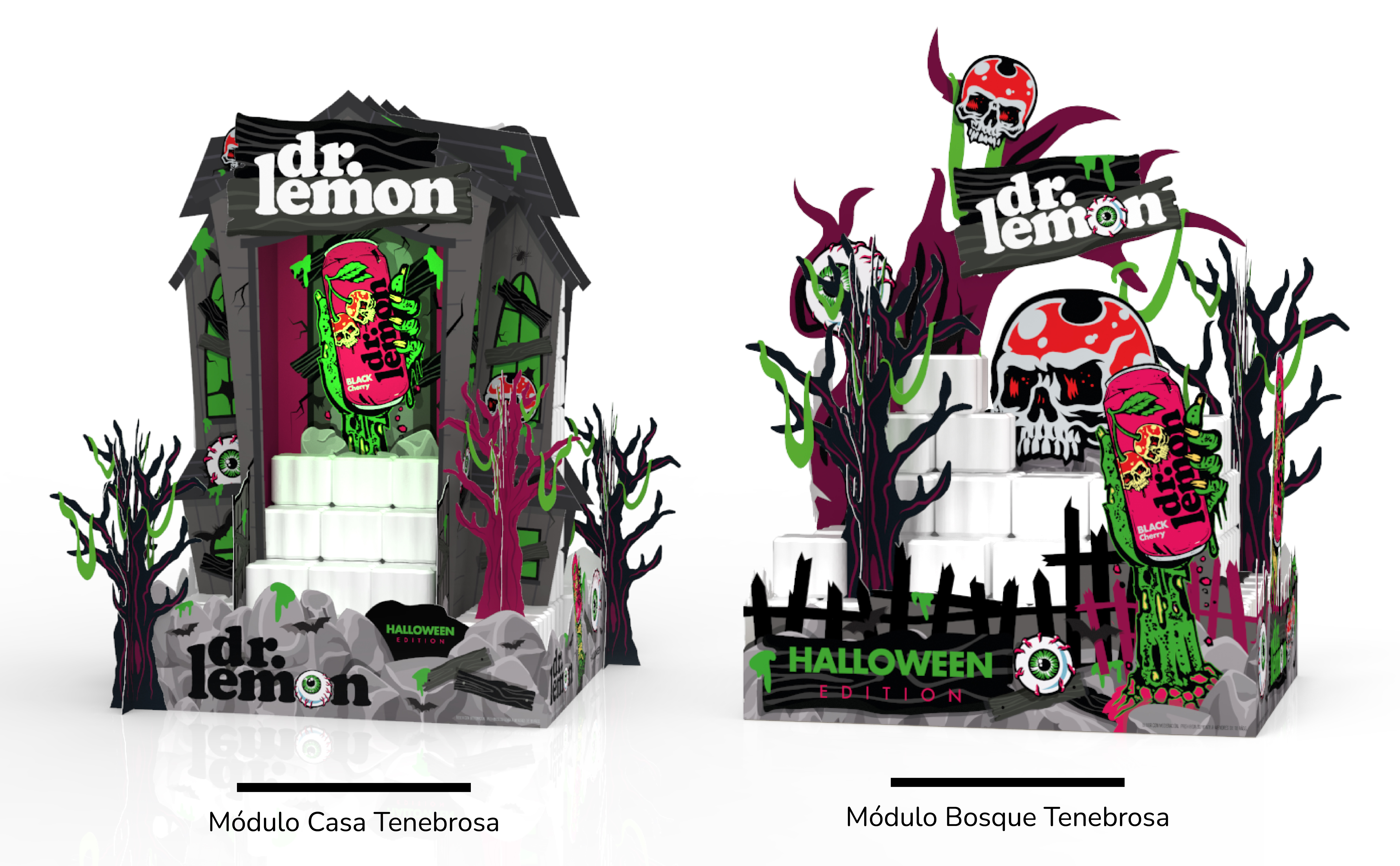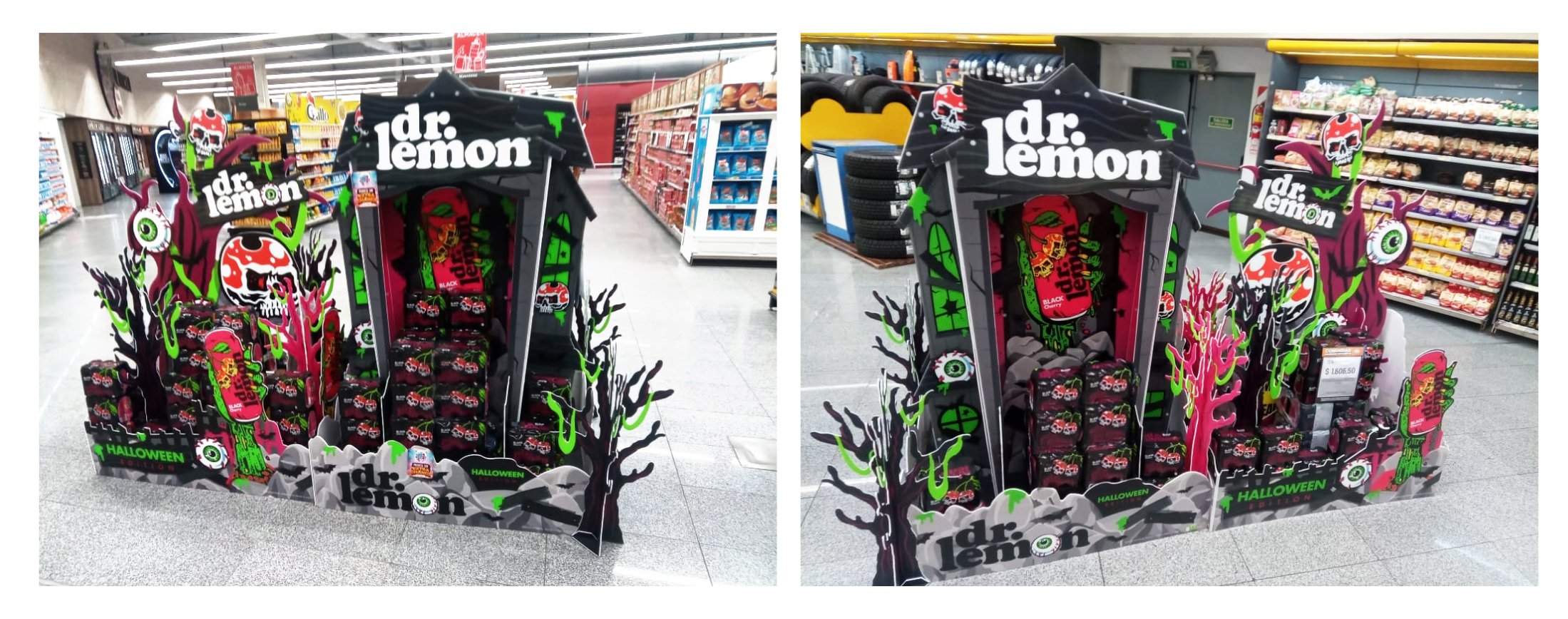 Comunicar nueva lata de DR LEMON HALLOWEEN sabor cherry. Darle movimiento y novedad a la marca para la pretemporada en una de las noches + festejadas por los jovenes. Target 18-22 DE NSE C3-D1. Con materiales de gran impacto q destaquen por su creatividad. Para ello se requirió lograr materiales de exhibición especial y secundaria para ubicar en pasillo central o primer frente y para exhibiciones perimetrales para el resto del salón, para ubicar en laterales de punteras, pasillos, etc. y generar material para lineal de góndola que destaque el producto de la edición especial.