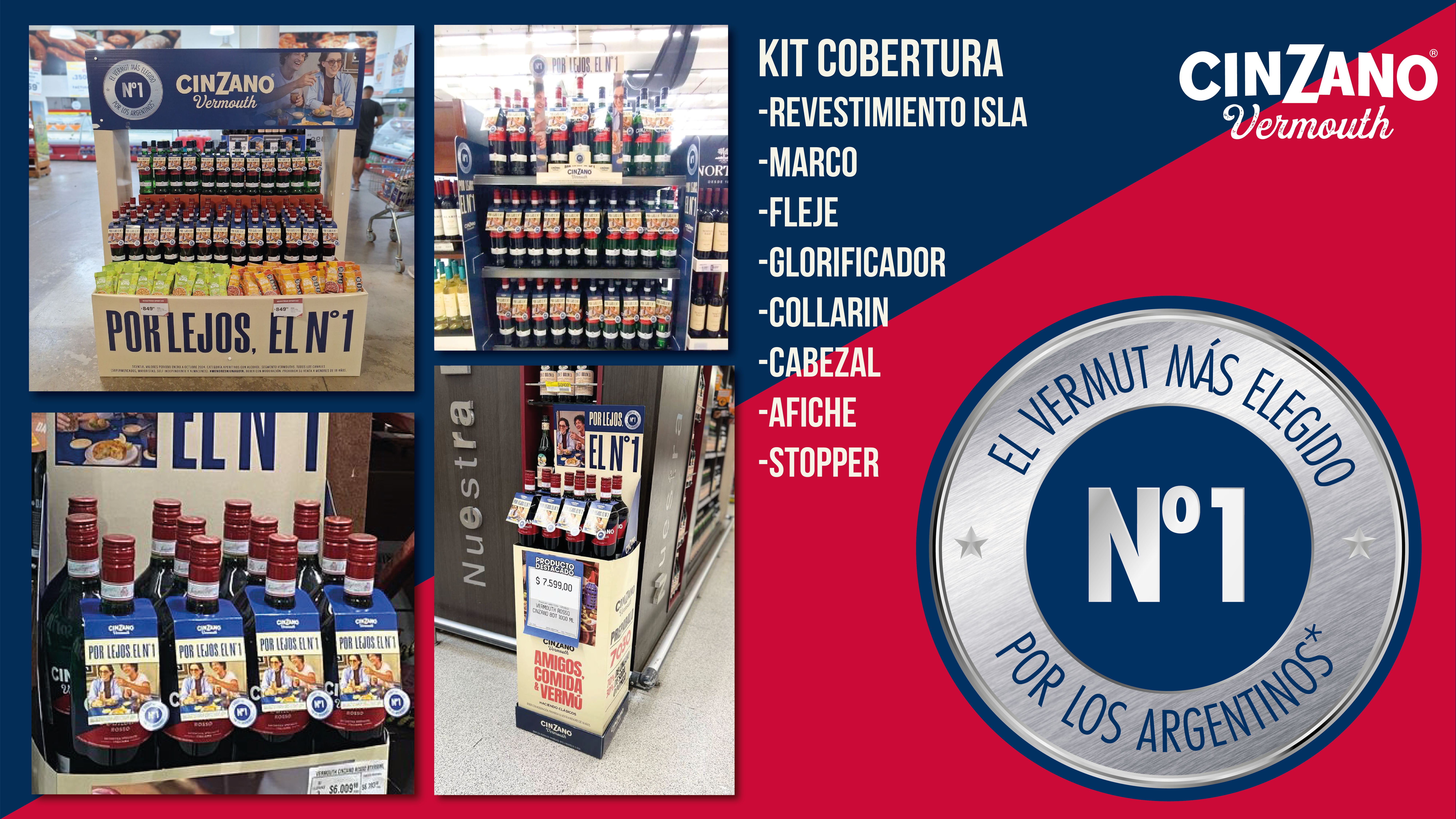 Se diseñó un key visual que destaca a Cinzano como el N1 y el claim “Por lejos el N°1” , sumado al apoyo con imágenes de situación de consumo. El kit de materiales POP liviano contó con 8 materiales livianos que permitieron cubrir todo el recorrido del shopper en el punto de venta: : Afiche A3, collarín para botella, ( impresos en offset a 4 colores) Marco de góndola, Fleje de góndola y Stopper, Glorificador de botella ( Realizados en plastico PAI impresos 4-0 en cama plana). Revestimiento de pallet (Realizado en corrugado plástico) , kit cobertura, funda para exhibición cruzada de cajas, realizado en impresión offset sobre cartulina.