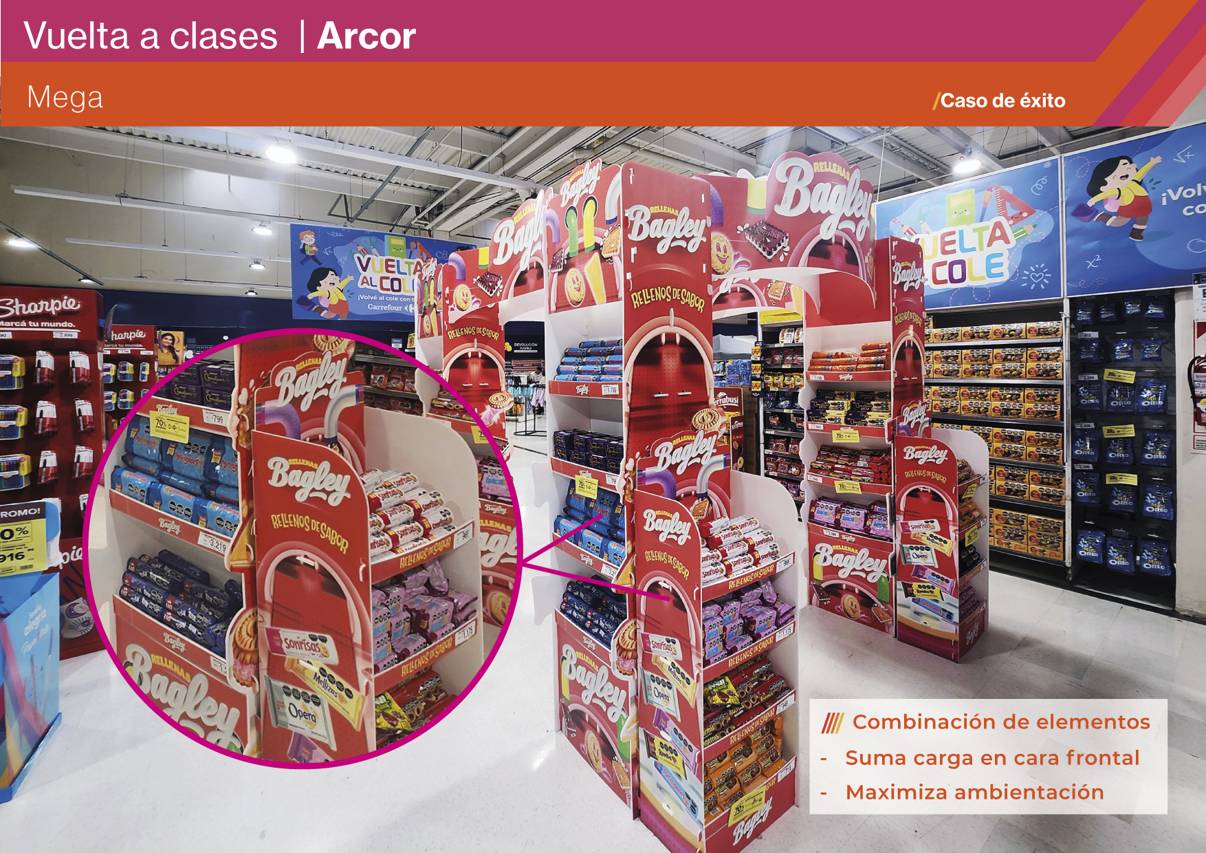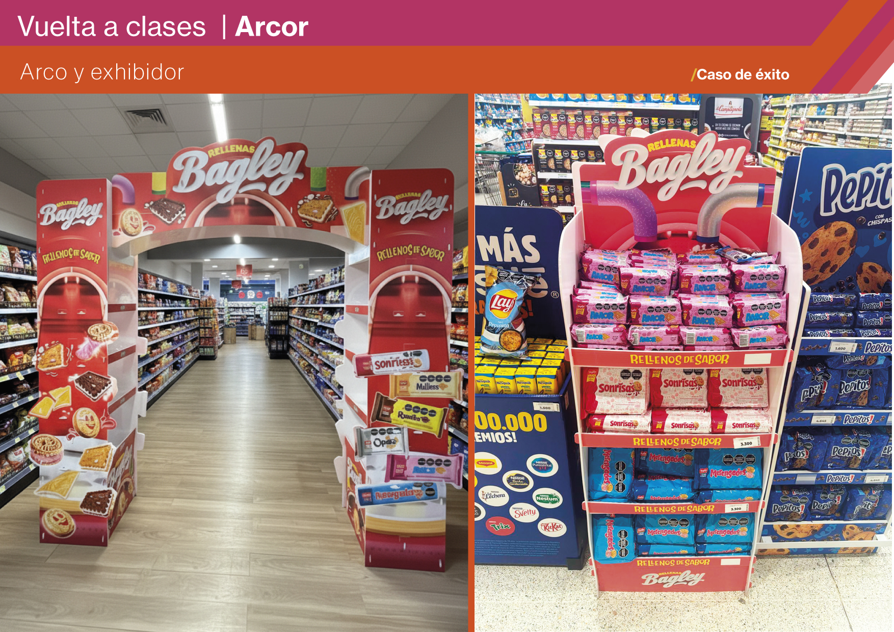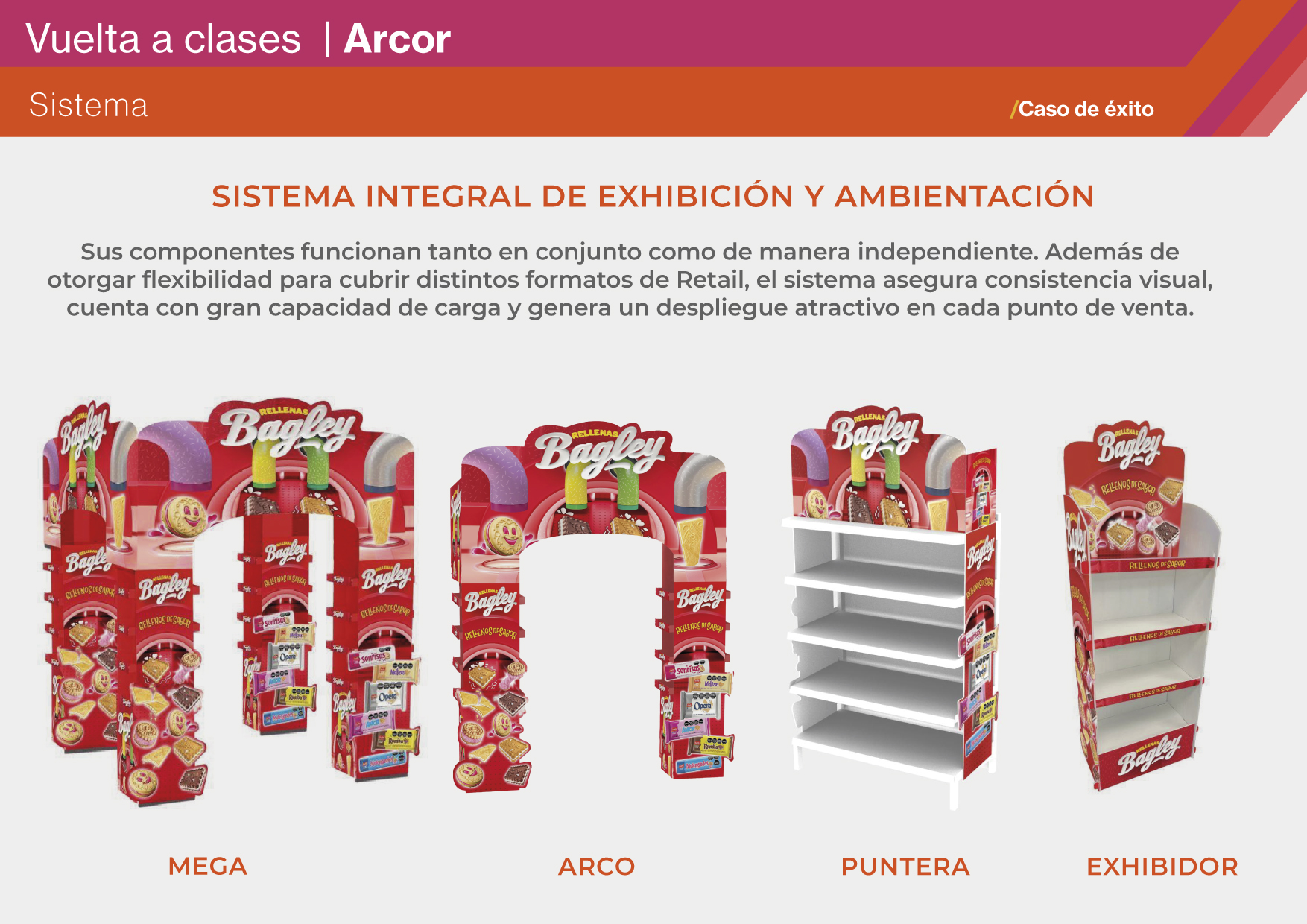 El desafío fue diseñar un sistema de exhibición capaz de sobresalir en un entorno cargado de estímulos visuales, transmitiendo la identidad de los productos de Bagley de manera clara y atractiva. El cliente buscaba una solución de alto impacto que garantizara gran visibilidad de producto, orden en la presentación y un despliegue versátil que incentivara la compra por impulso. Además, era clave reforzar el concepto de “Rellenos de sabor” como atributo diferencial de la marca. Los objetivos fueron generar flexibilidad para adaptarse a distintos formatos de retail, ofrecer consistencia estética en cada punto de venta y convertir la exhibición en un recurso estratégico de comunicación y recordación de marca.