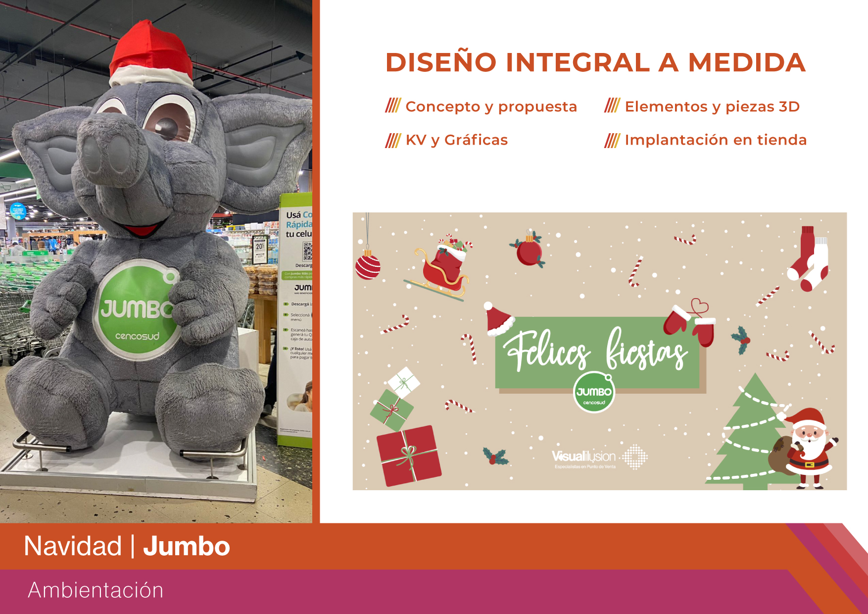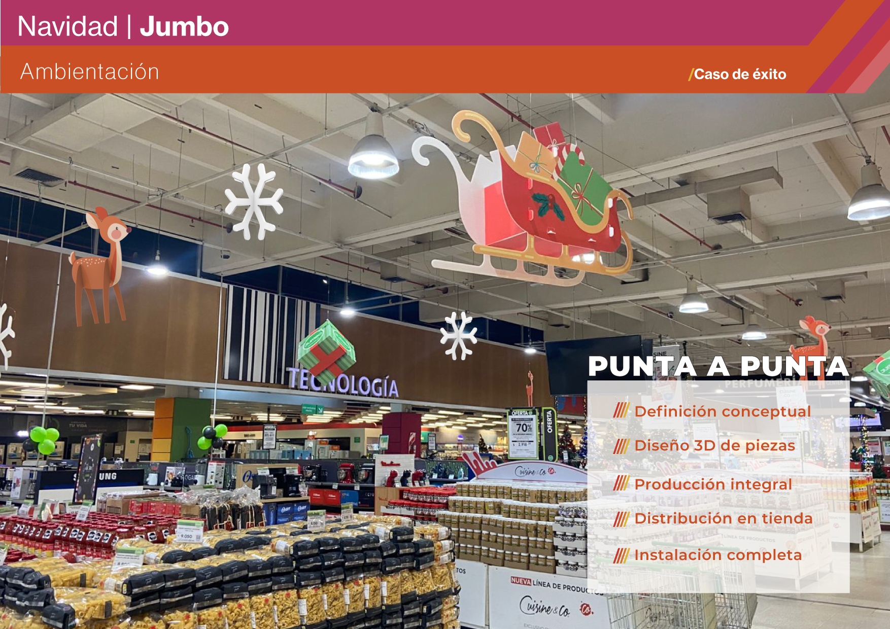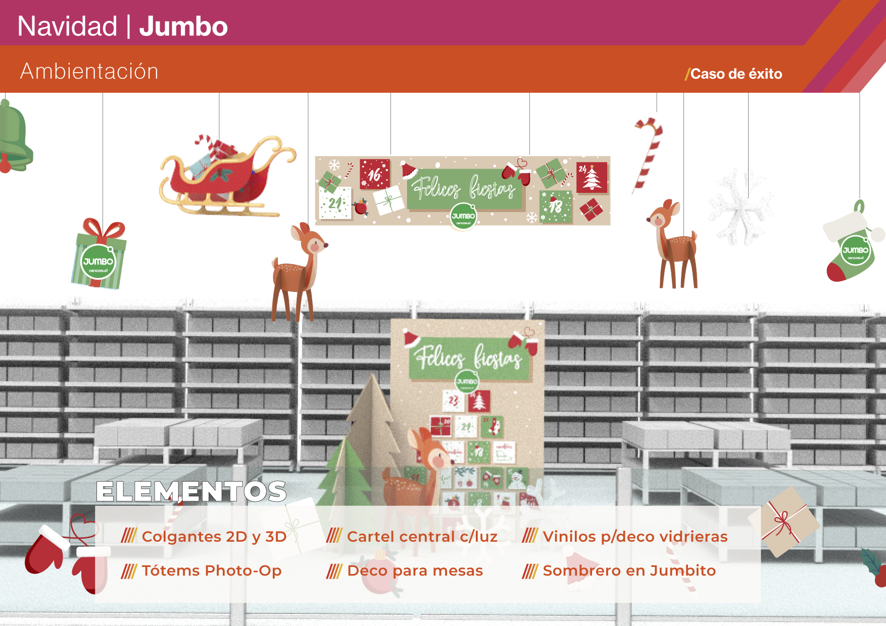 El desafío fue crear una ambientación navideña integral para Jumbo, transformando el espacio de compra en una experiencia festiva con fuerte impacto visual. El cliente buscaba una propuesta que captara la atención del shopper, acompañara la comunicación de la marca y potenciara la conexión emocional en una de las fechas más relevantes del año. Los objetivos fueron transmitir el espíritu navideño con una estética cálida y colorida, destacar íconos como Papá Noel, trineos, árboles y regalos, y lograr que cada visita se convirtiera en un momento memorable, elevando la experiencia de compra y reforzando el vínculo con Jumbo.