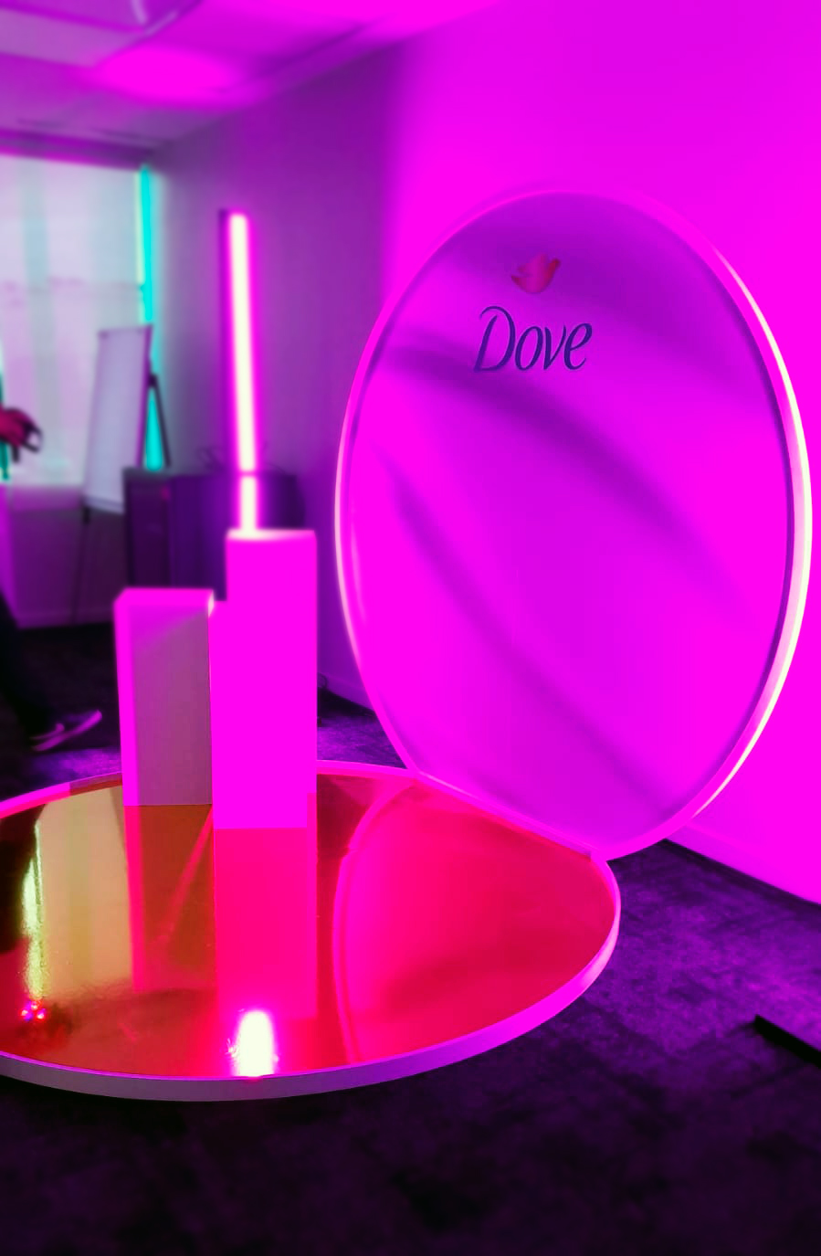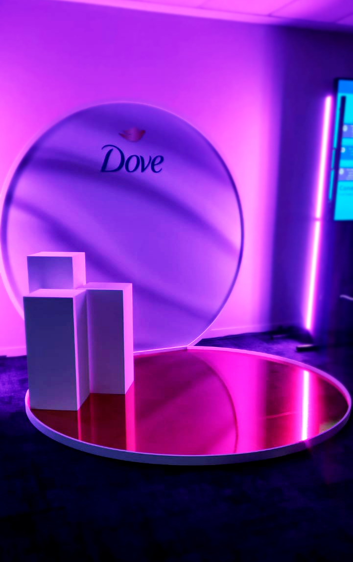 El stand fue construido en MDF de alta densidad con acabados premium y superficies espejadas que generaban profundidad y reflejos. La iluminación LED estratégica, con tonos fríos y cálidos, realzaba la arquitectura y la piel de los visitantes, alineándose con el concepto de “belleza real” de Dove. Diseñado como un set de belleza a escala real, invitaba a interactuar, probar productos y tomarse selfies, creando una experiencia inmersiva y personalizada que conectaba emocionalmente con la marca.