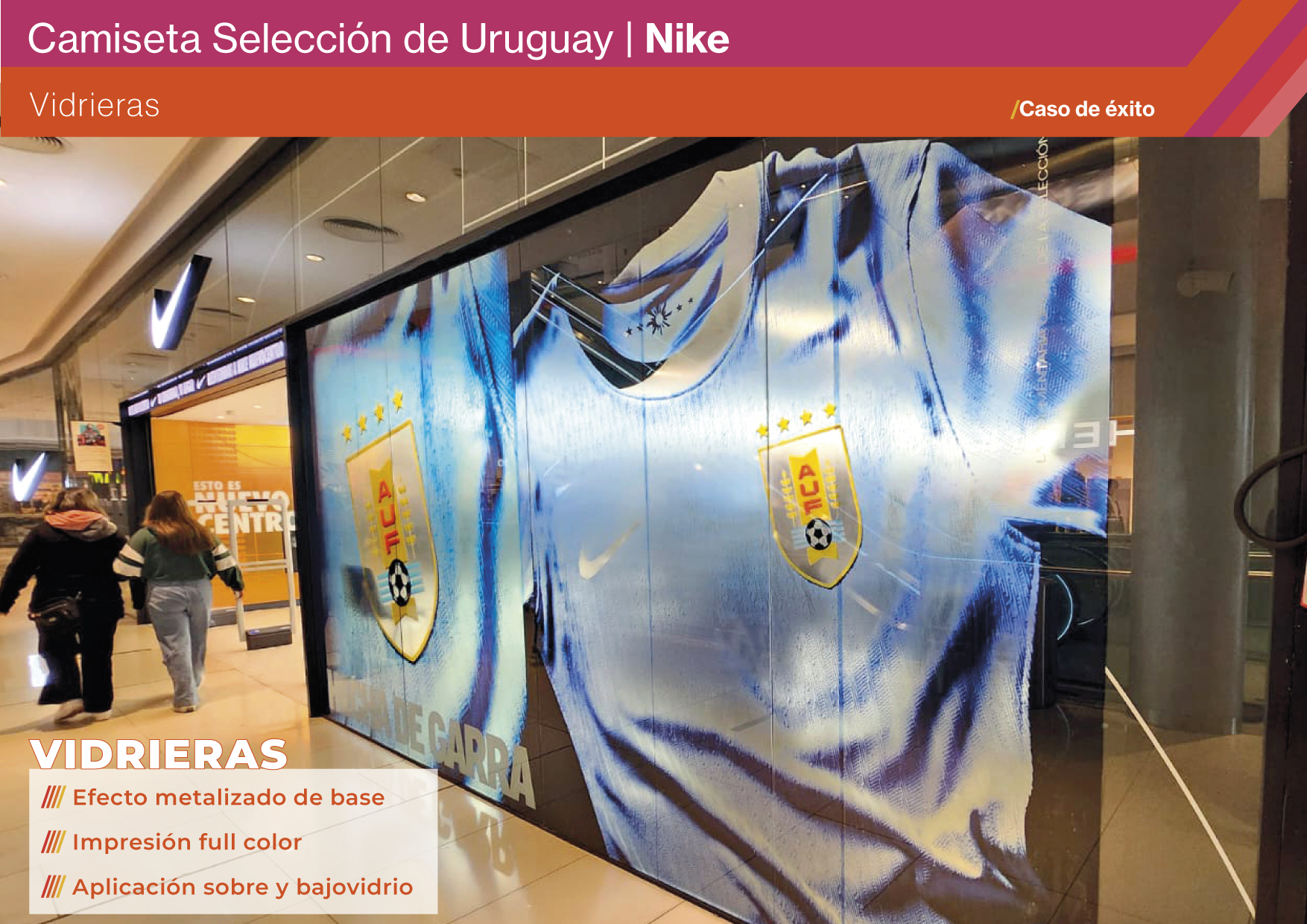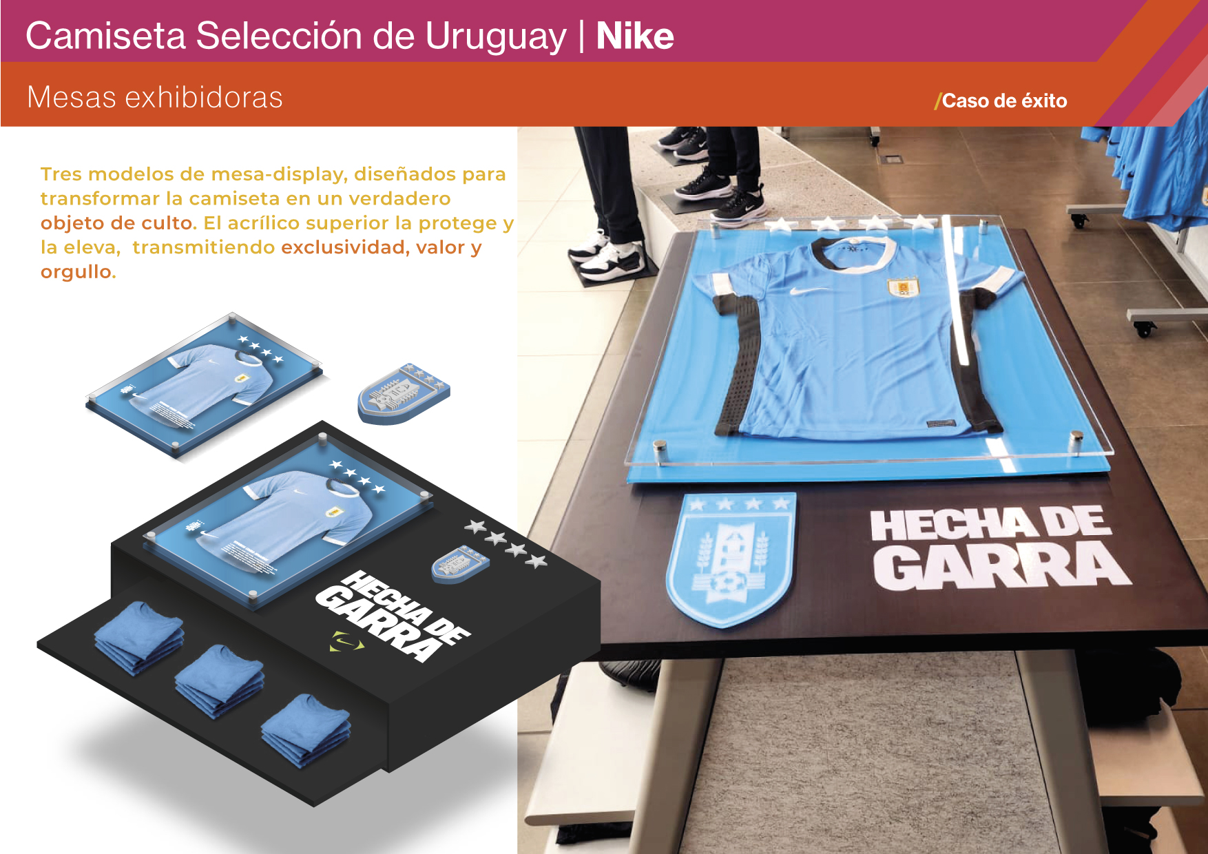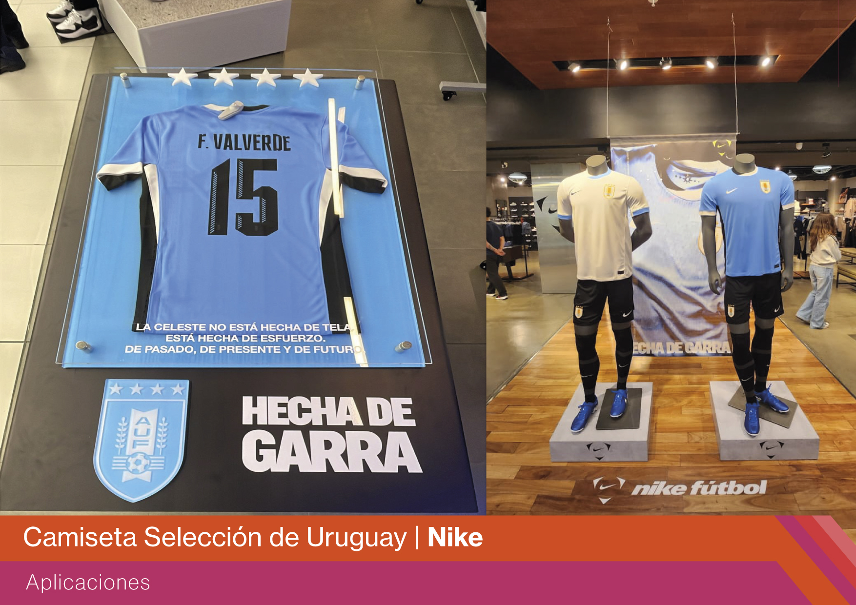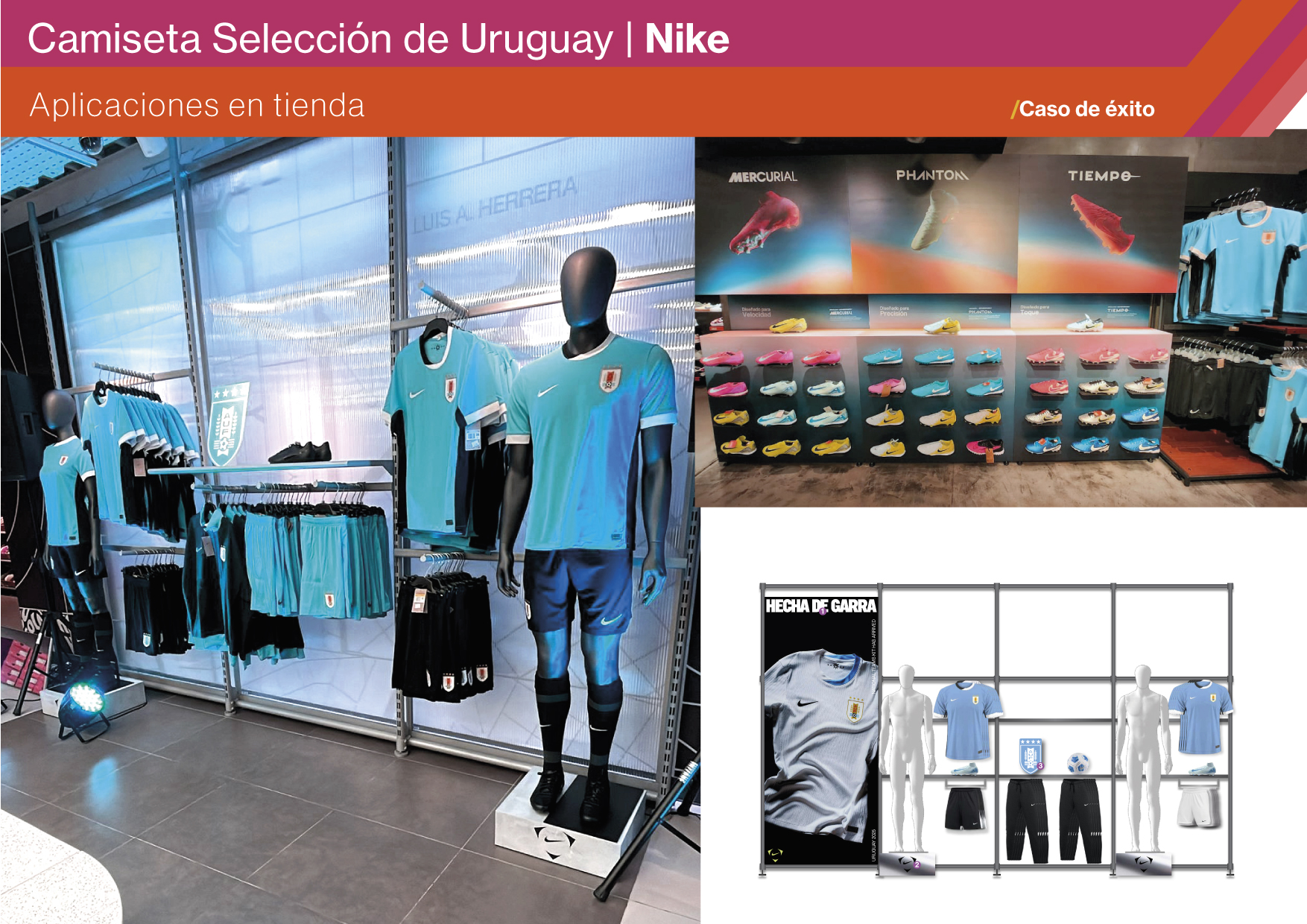 El desafío fue diseñar un espacio en el punto de venta que destacara la nueva camiseta de Uruguay de manera visible e impactante, transmitiendo la garra y la identidad de la selección desde el primer segundo. Nike y la AUF buscaban una ambientación que fomentara la interacción y conectara emocionalmente con los fans. El requerimiento incluía la implementación en 8 locales en simultáneo dentro de una ventana de tiempo muy acotada, lo que elevó la complejidad del proyecto. Los objetivos fueron dar protagonismo al nuevo kit, recrear la esencia de la celeste en tienda e integrar recursos de la campaña “Hecha con Garra” para reforzar el vínculo entre marca, selección y público.