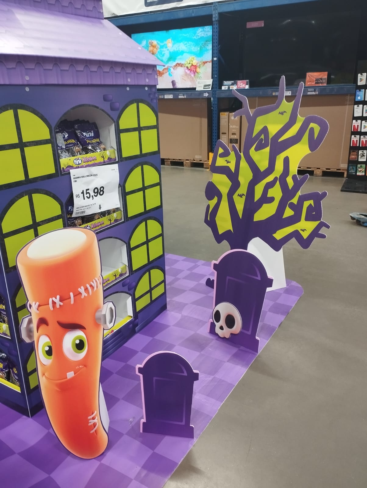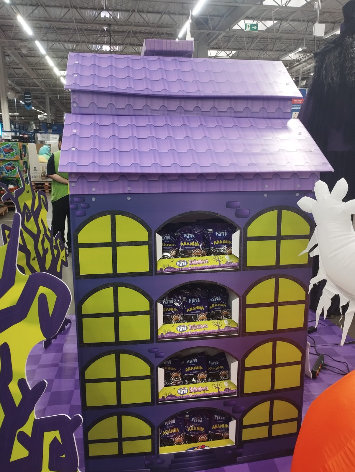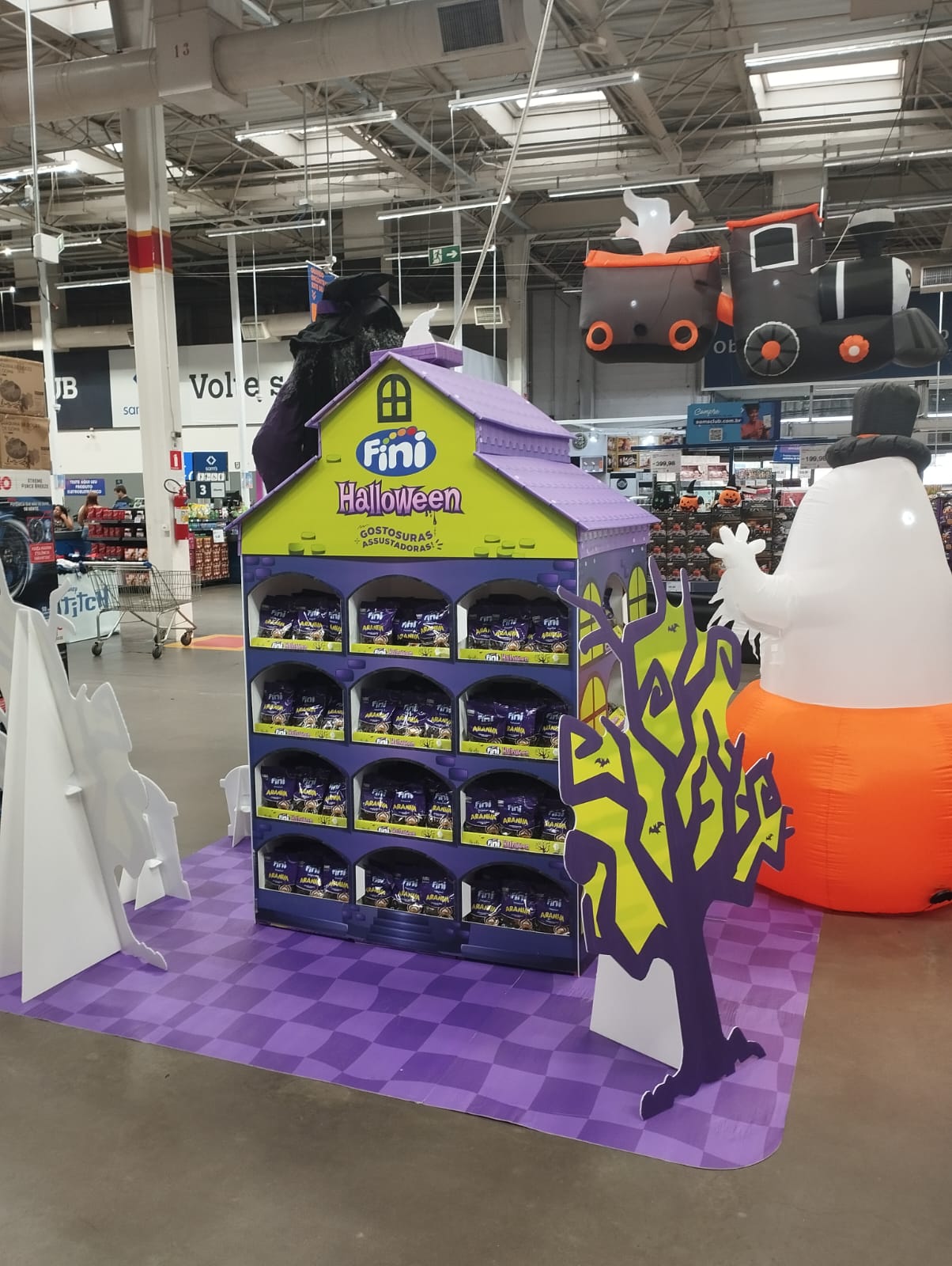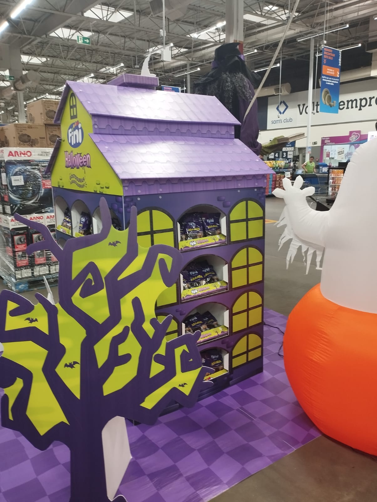 Para lograrlo, se construyó una auténtica casa embrujada dentro del PDV: uniendo displays temáticos, gigantografías y detalles escenográficos que evocaban calabazas, telarañas y monstruos juguetones. El espacio 360° convirtió la compra en recorrido temático, con un look & feel que respiraba Halloween por cada rincón. El mayor reto fue combinar impacto visual, practicidad de montaje y solidez estructural, garantizando que cada pieza transmitiera el ADN divertido de la marca.