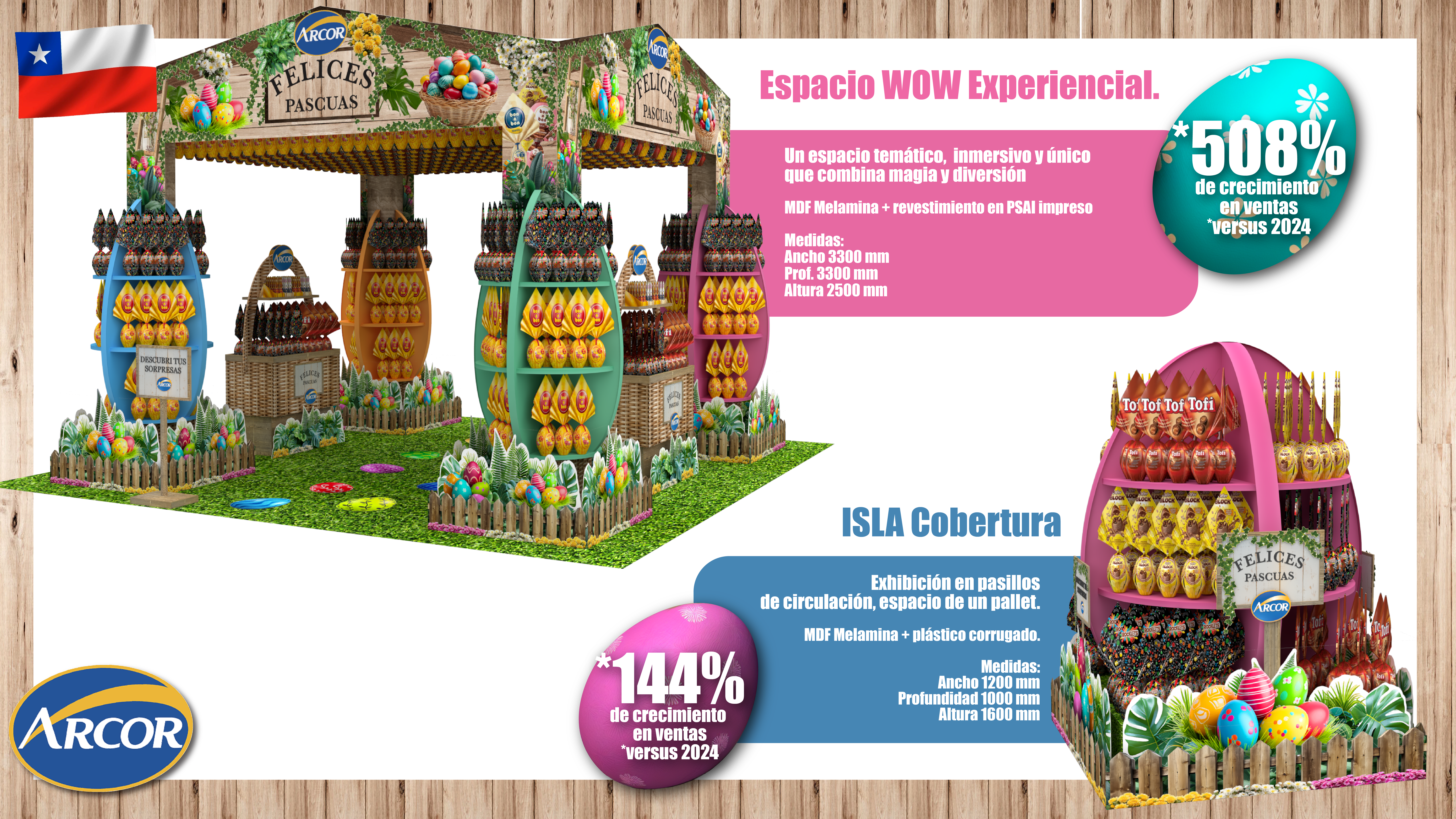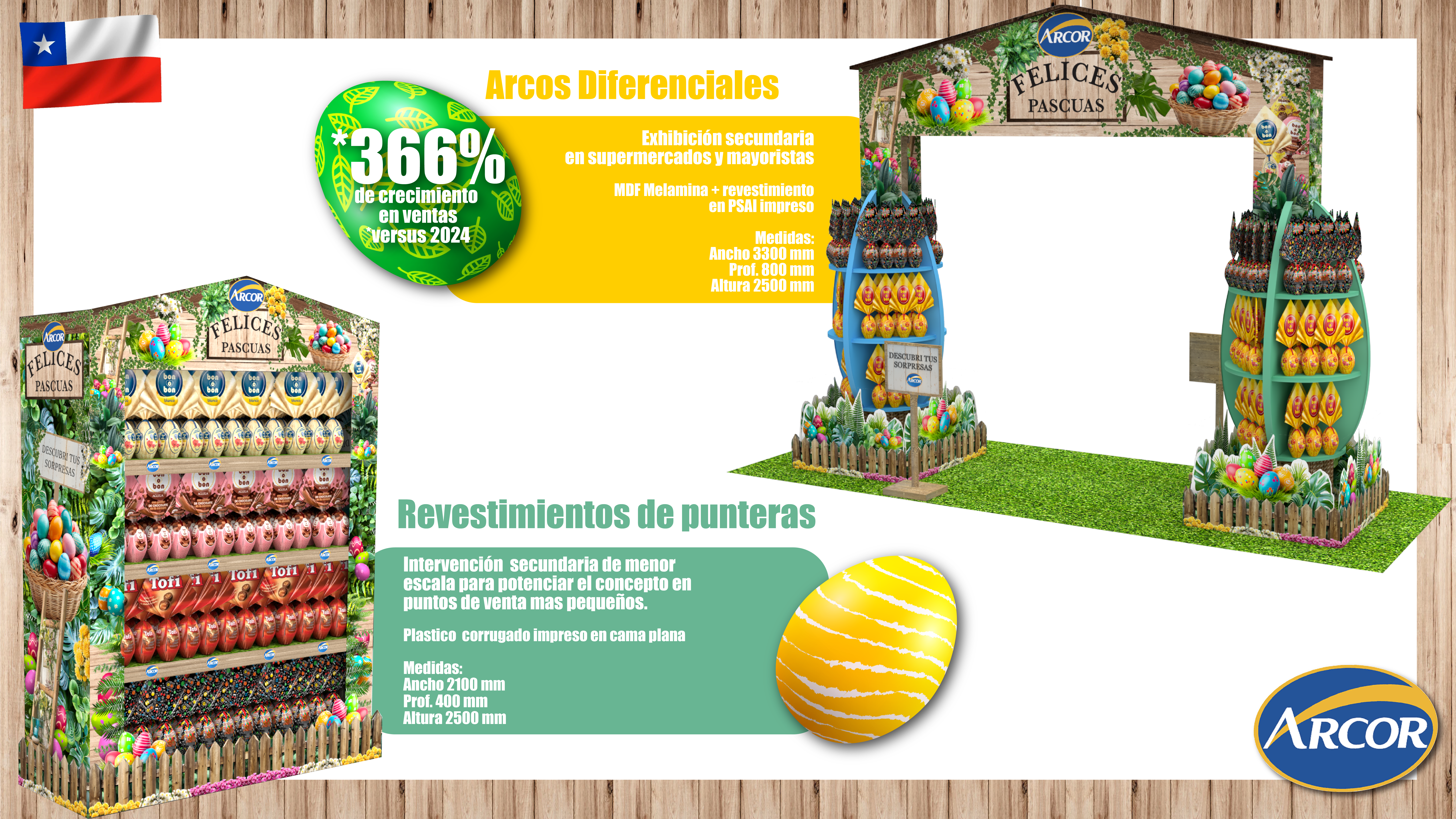 El Brief planteaba como desafío destacar la exhibición de Arcor en las Pascuas, en un contexto de alta competencia y uniformidad en el canal moderno de Chile, regulado por los retailers y con displays estándar.