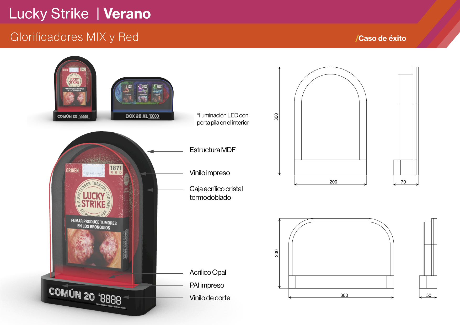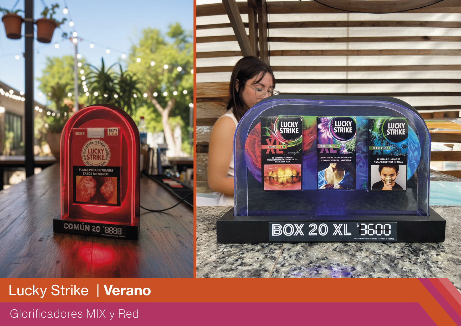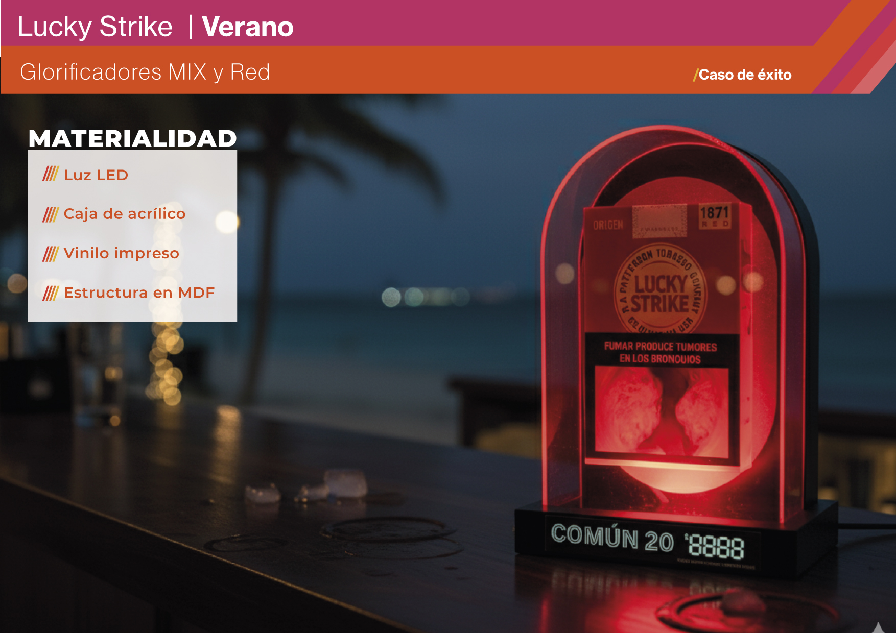 La pieza se desarrolló con una combinación de MDF, vinilo impreso, acrílico termodoblado y iluminación LED, logrando una terminación de alto impacto visual y durabilidad. El diseño incorporó una caja acrílica iluminada para destacar producto en entornos de baja luz y generar un efecto premium en sintonía con la estética nocturna. Se sumaron falsas cajetillas de gran tamaño, que exageraban el producto para darle mayor visibilidad y presencia en los locales. Además, se incluyó un tag frontal para precios, reforzando la funcionalidad de exhibición. La propuesta se concibió de forma integral, desde concepto hasta producción, consolidando un glorificador urbano, atractivo y representativo del ADN Lucky Strike.