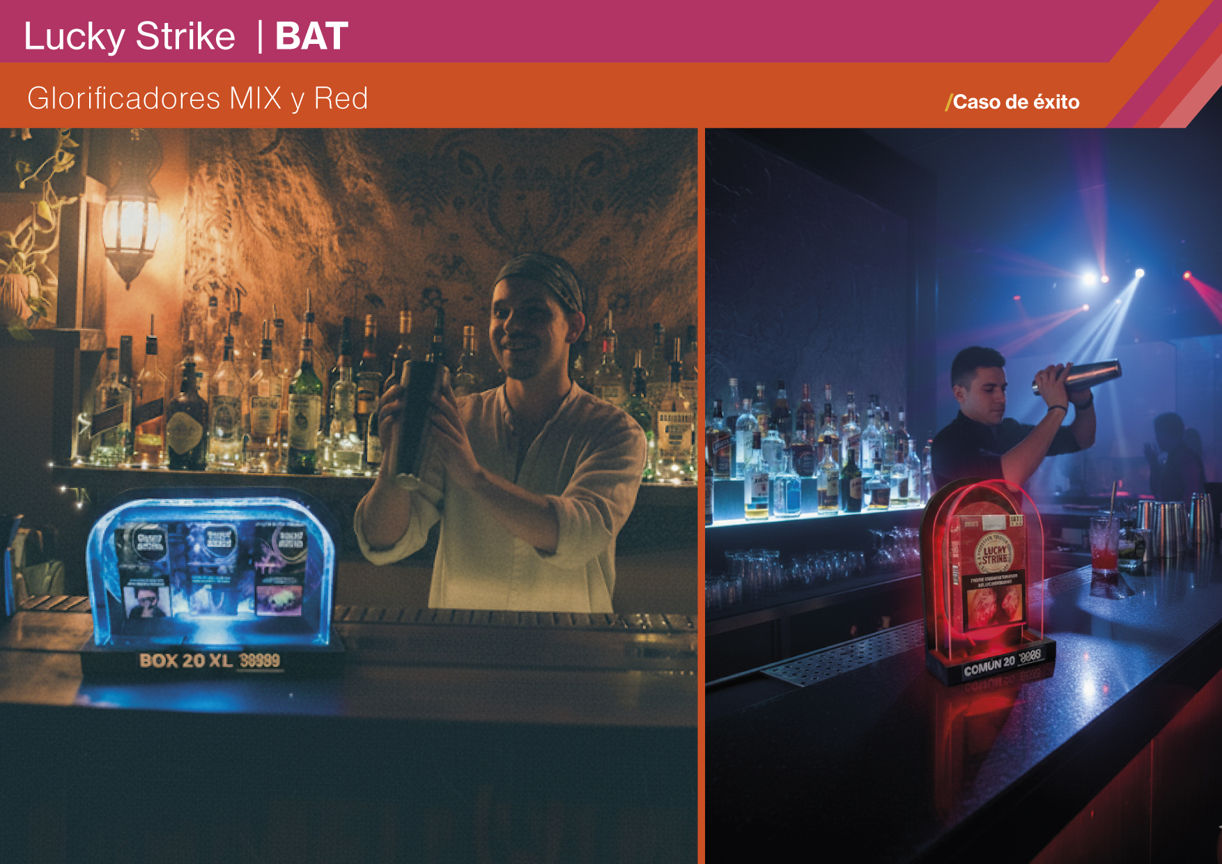 El desafío fue diseñar una pieza de exhibición para puntos de consumo on premise nocturnos, capaz de destacar en ambientes de baja iluminación y alto movimiento. El cliente buscaba transmitir el carácter urbano y distintivo de Lucky Strike, reforzando la presencia de marca en un contexto competitivo. El objetivo principal fue generar un impacto visual inmediato que captara la atención del público adulto e invitara a interactuar con la propuesta. A su vez, se debía exhibir de manera atractiva los productos MIX, asociándolos a la coctelería y al ritual de mezclar, y mostrar la variante Lucky Strike Red Origen, consolidando un espacio que uniera innovación, actitud e identidad de marca.