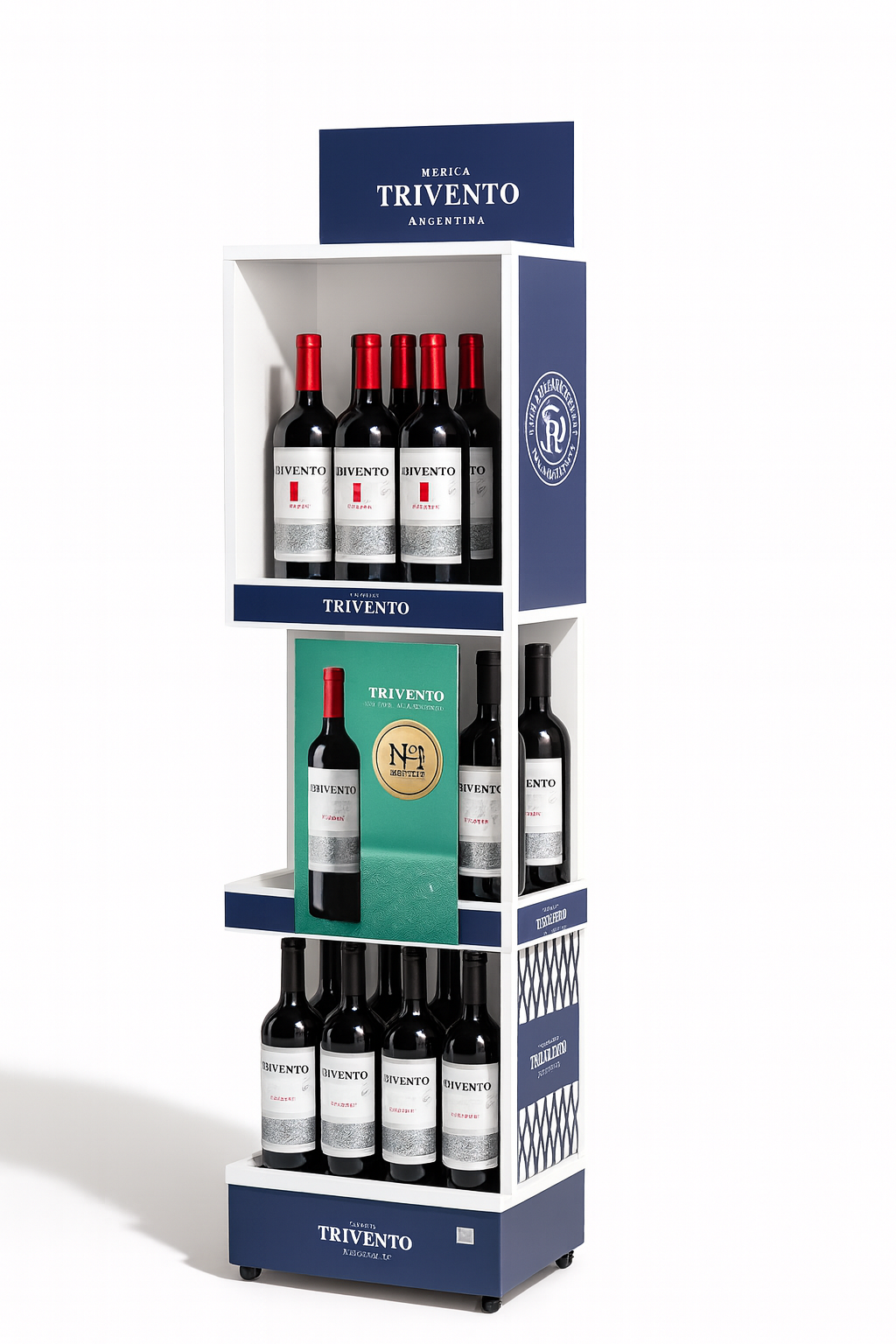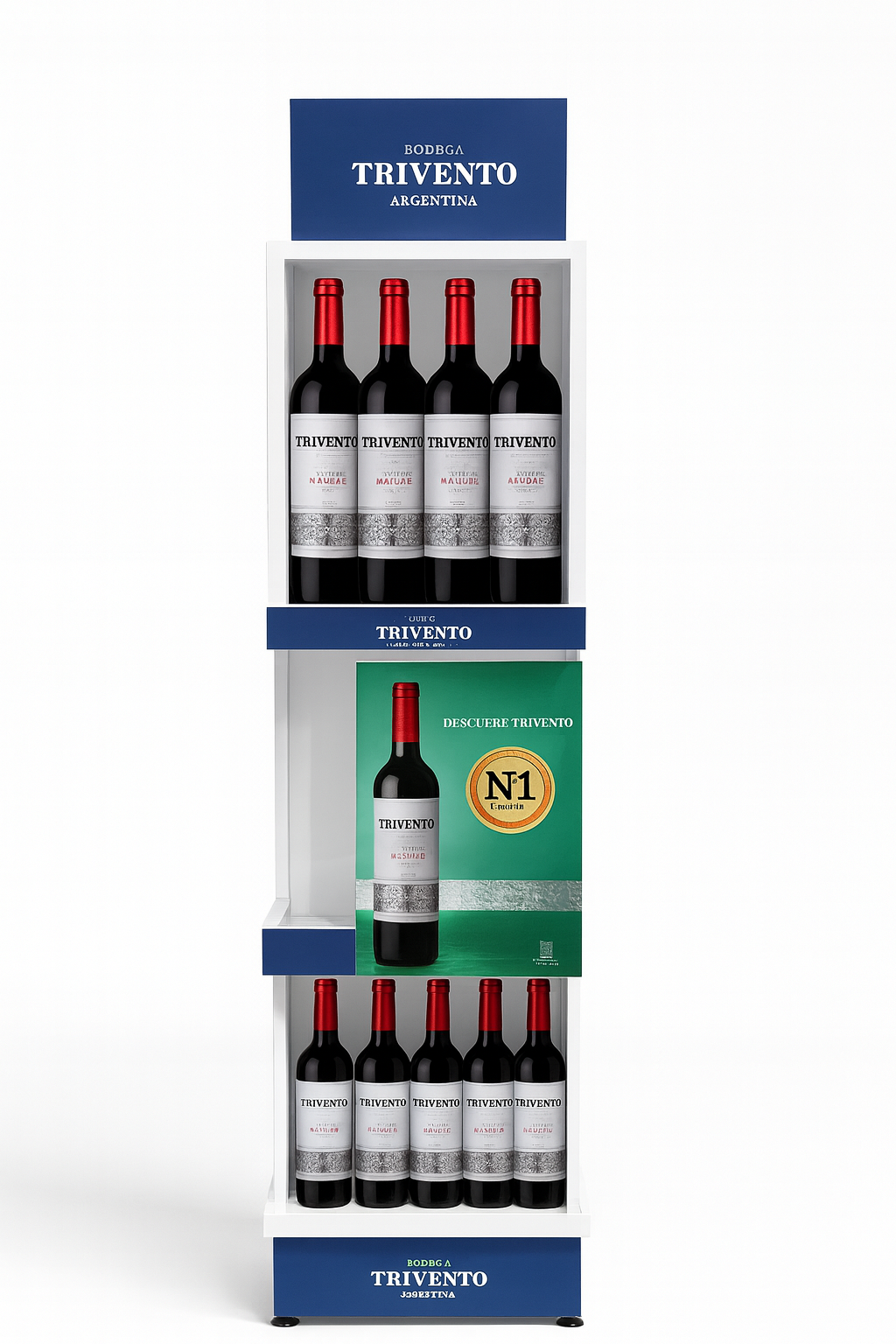 La estrategia se centró en optimizar la capacidad de exhibición, logrando un exhibidor capaz de contener una alta carga de vinos. Se trabajó con una estructura metálica resistente para garantizar su vida útil, complementada con gráficas de impresión de alta calidad y laca sectorizada que realza los detalles visuales. El desafío principal fue mantener el costo bajo sin sacrificar diseño ni resistencia.
